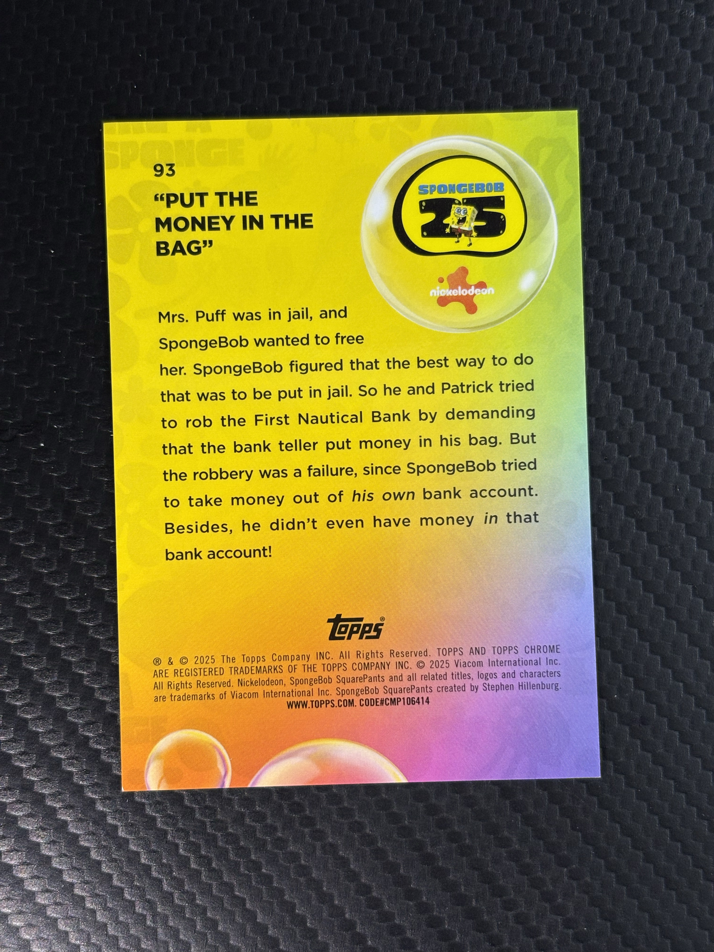 【面包拍卖】 2025 Topps Chrome SpongeBob 海绵宝宝 元年 TC Put the Money In the Bag 把钱放在袋子里 派大星 白碎冰  瑕疵如图 鹏哥
