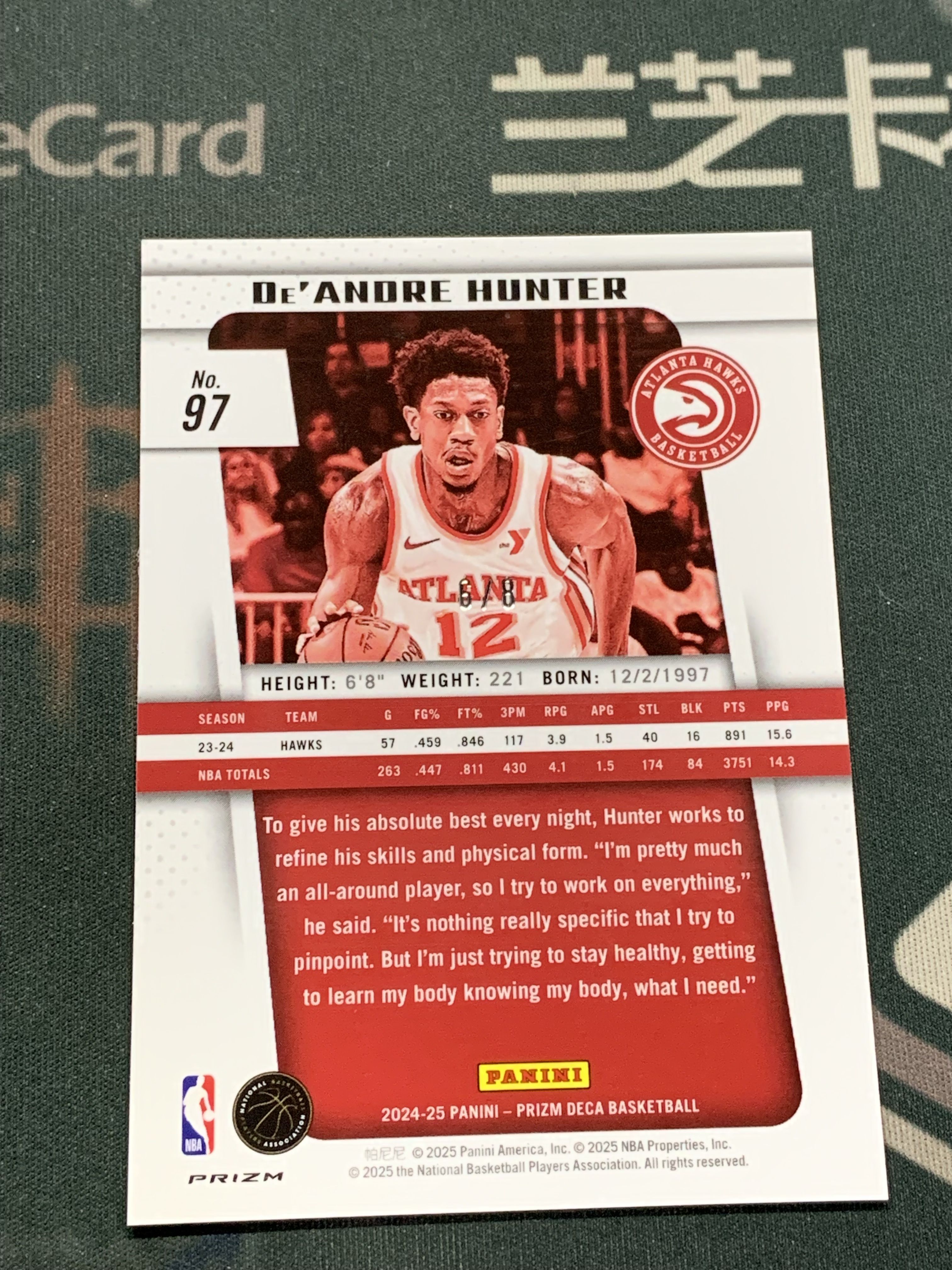 墨迹,卡品如图请看仔细,照片很清楚!请看清楚再拍!邮费默认中通:江浙沪皖10元,其它地区15元,超重另算。顺丰到付默认陆运,如需要空运请留言说明。卡淘是线上付款,不累计。所有拍品图片不管有没有卡具都不包含卡具,单卡过百送夹过千送砖!如需卡具请另付费用。卡具具体金额请发站内信询问。打包卡不保证每张都套卡膜,不保证每张卡品,个别瑕疵不会注明,介意勿拍!所有卡有疑问均可以发站内信或者QQ索要细节图!折射系列系列经常会有一道折射横线或竖线是印刷问题不属于卡品残次范畴,印刷线在我们这里不属于卡品问题!介意者请勿拍!厚卡、老卡有轻微白边白角都属于正常现象!如无特殊说明均为通行品。IMM,NOIR,木盒,金书等厚卡系列卡品一般,边角经常有小问题介意勿拍!镜面卡签字经常有横条竖条印刷划痕属于正常通行品相,评级卡砖上的划痕和pri破损以及评级砖内的卡有卡品问题一律不属于品相问题!各种prizm base以及银折表面的轻微划痕为正常卡品,要评级追求金标和10分者请直接购买金标和10分评级卡。如有特殊情况可以累计2周,累计期的卡以及超出超出2周累计期的卡不再处理任何卡品问题。丢失责任自负!所以请在3天内付款。付款后我们会在3天内发卡,由于我们的发卡量巨大发货前无特殊情况不会回复站内信,请谅解!发货后单号会发站内信留言。12年线下卡店,元年卡淘11万点信誉老卖家兰芝卡社 代卖请加老王微信Loungecard