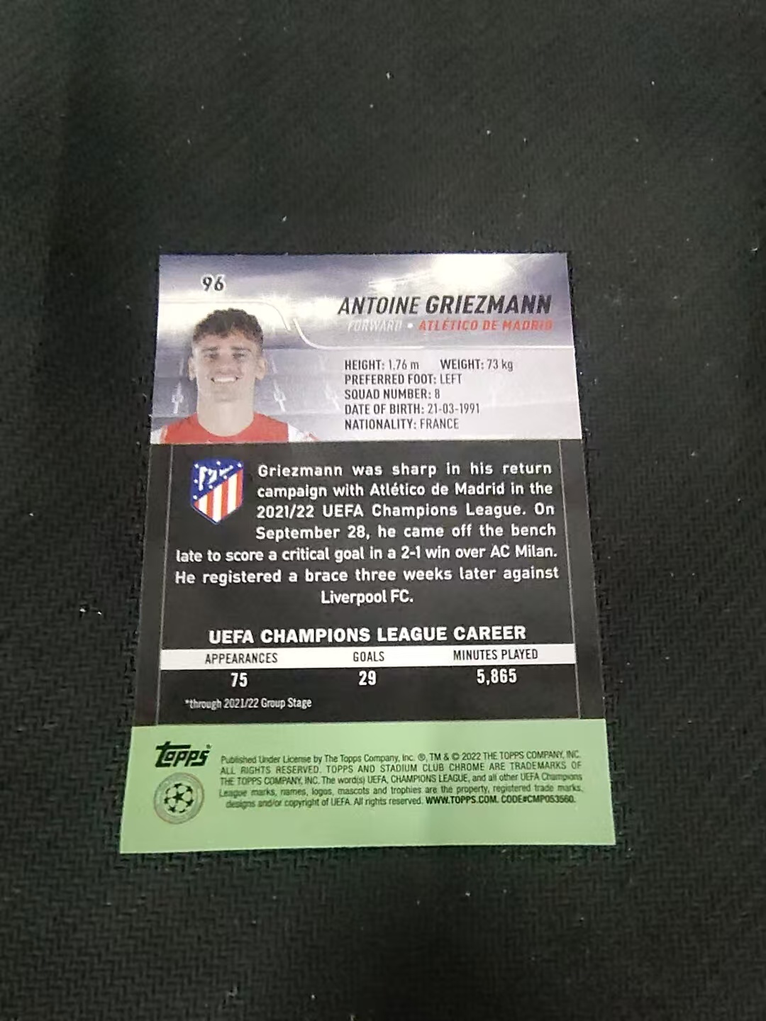 【可合并,不累计】2022 Topps Stadium Club Chrome Antoine Griezmann 马竞 格里兹曼 竞技场 欧冠 划痕 边角瑕疵 #96