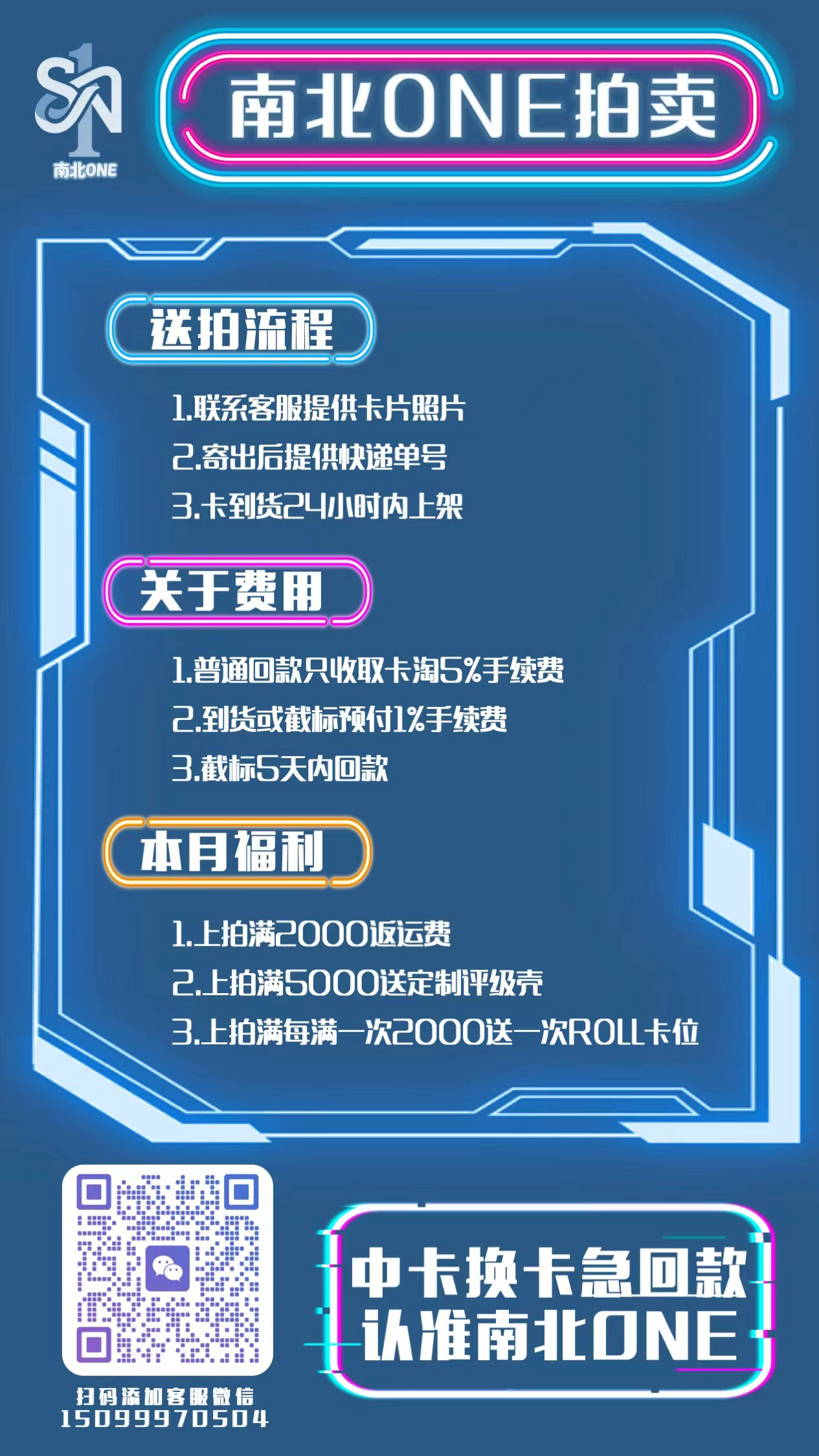【南北ONE拍卖 免手续费】广州地区上门取卡 如需代卖服务请加V咨询:【15099970504】【Jiucaipaimai】免手续费拍卖 急速回款预付60-80%竞拍前请卡友们认真观看以下规则 出价即视为已阅读规则且认同规则: