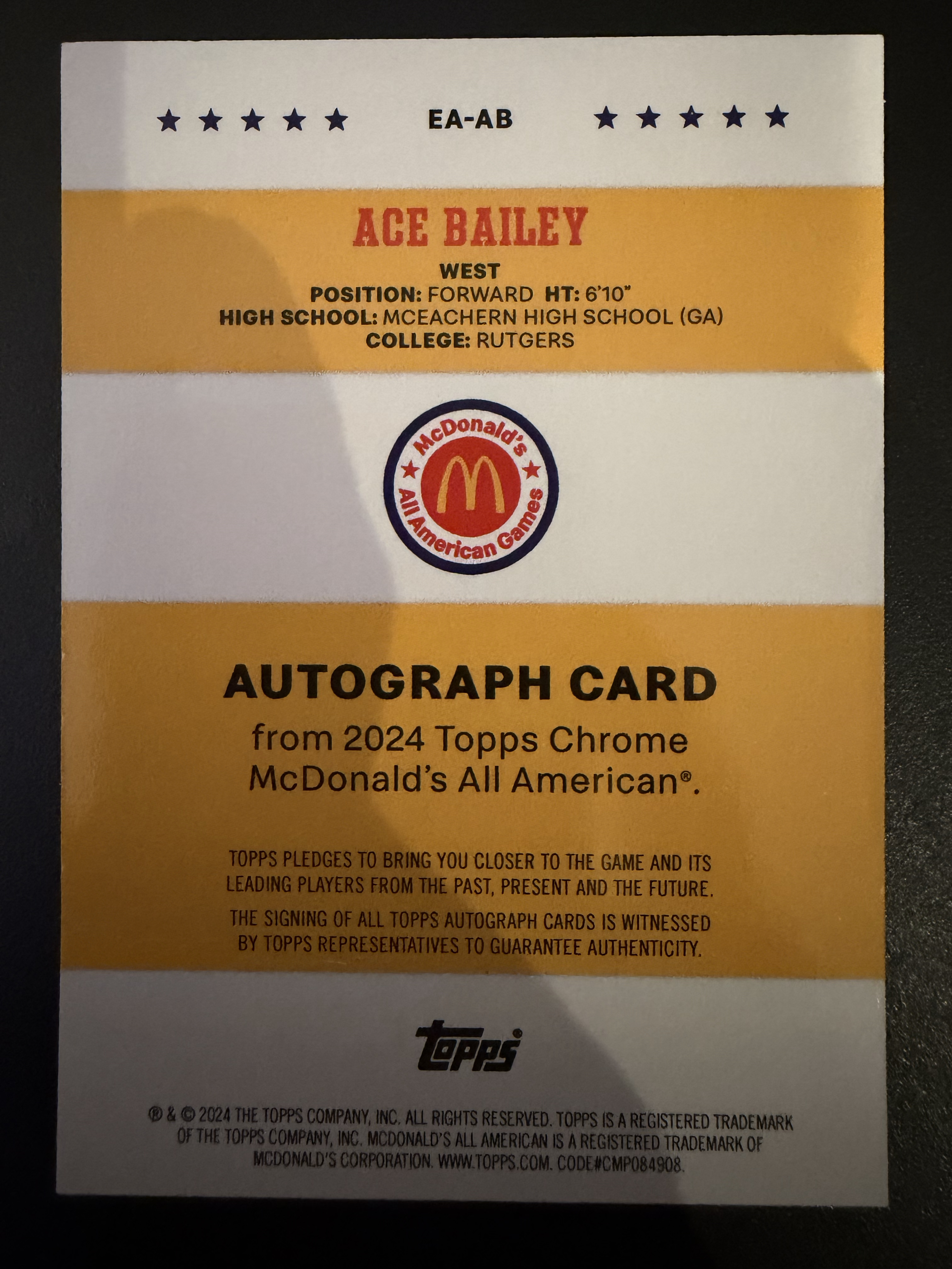 2024-25 Topps McDonald's ace bailey RC 麦当劳爵士探花新秀艾斯贝利明日签,卡品如图,收藏佳品,第一版签字,拍下后1-3天发货