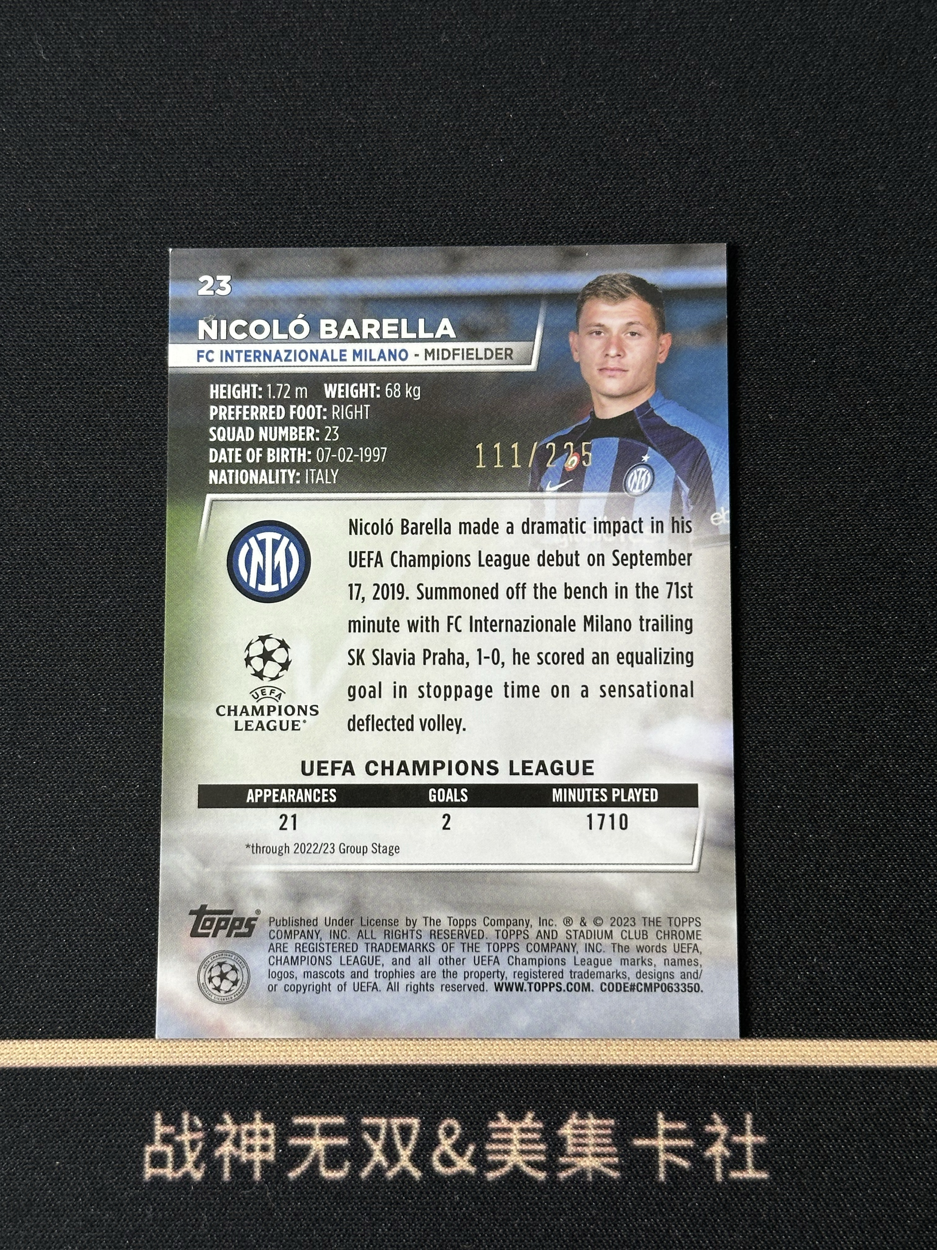 2023 Topps Stadium Club Nicolo Barella 竞技场 尼科洛 巴雷拉 国际米兰 111/225编 绿闪电折 欧冠 战神无双 (破境)