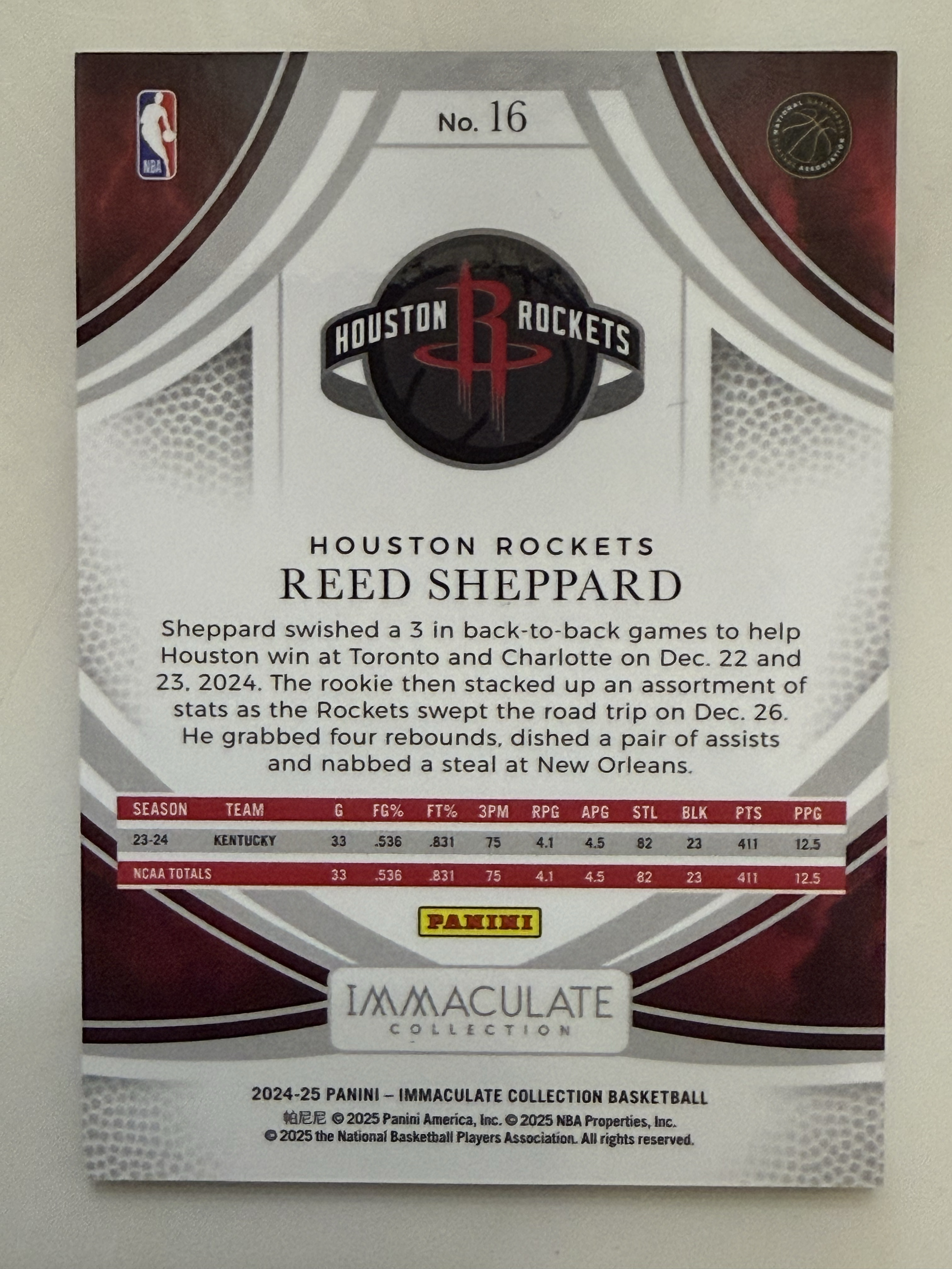 2024-25 Panini Immaculate Reed Sheppard RC 25编 新秀 爱咪咪 火箭 里德 谢泼德 base 专收必备 卡品如图