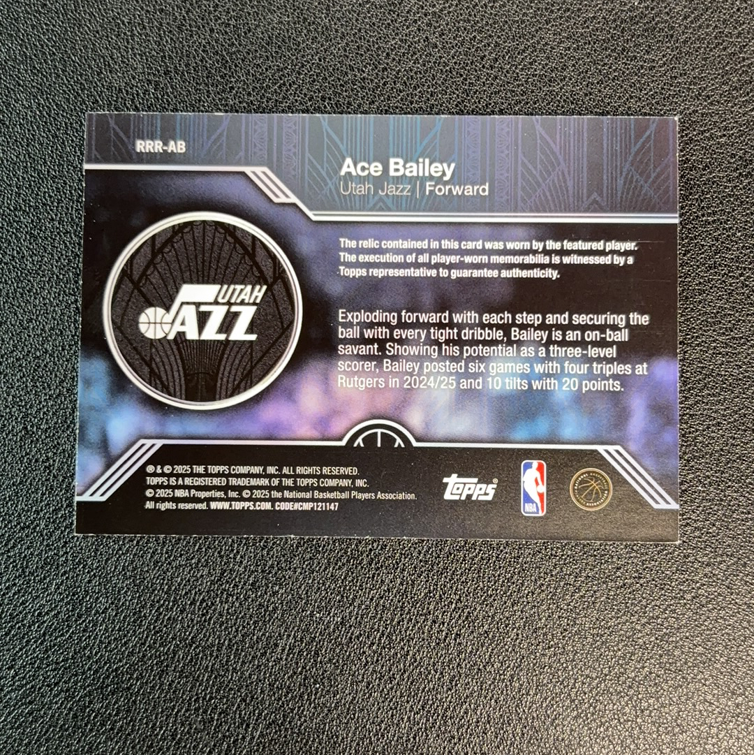 Ace Bailey 艾斯贝利 2025 Topps Flagship RC新秀 球衣实物料 小窗素球衣 Rounoball Remnants 爵士队 边角瑕疵如图 SH007 E441117