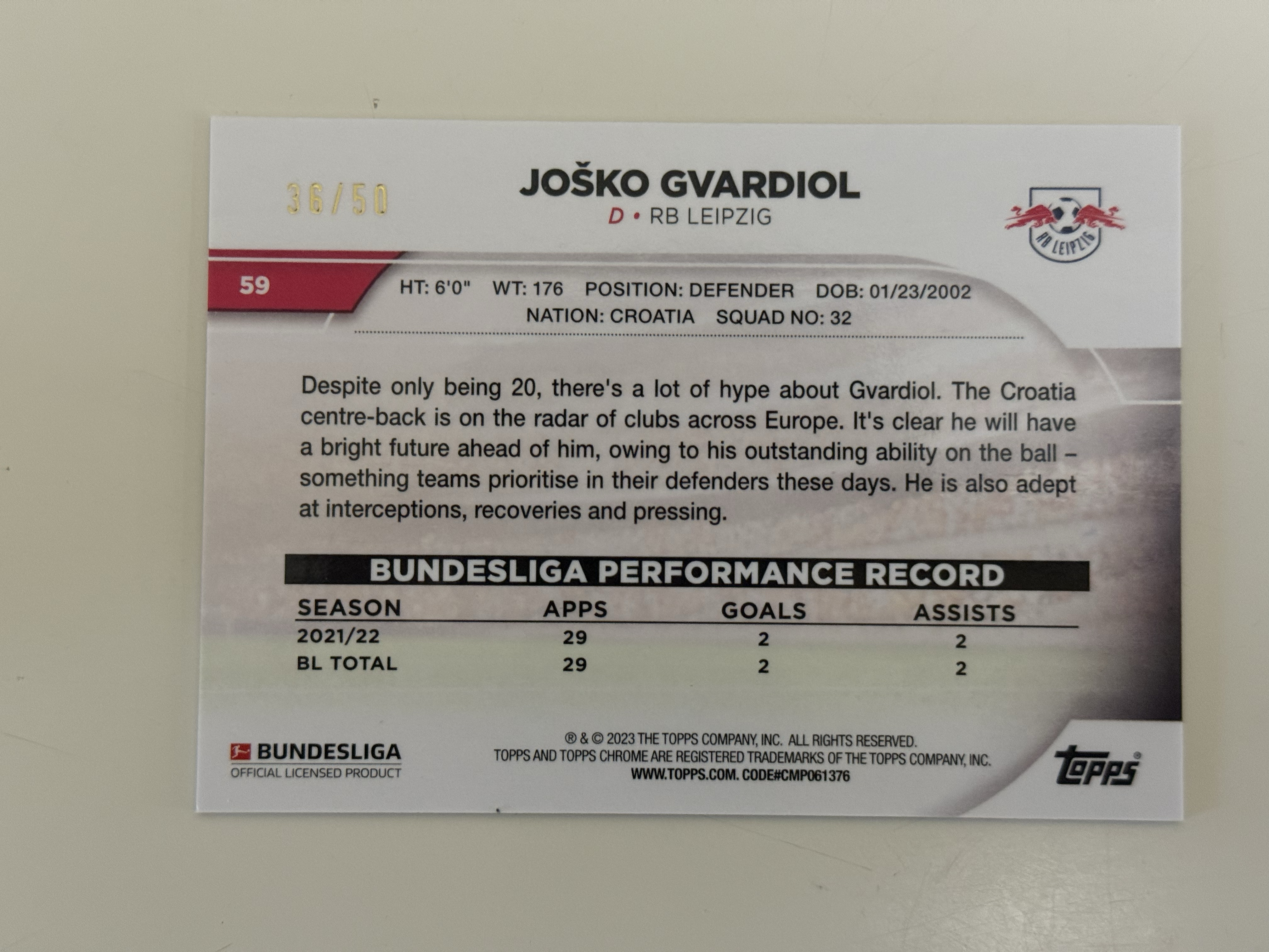 2022-23 Topps Chrome 德甲 莱比锡红牛 Gvardiol 格瓦迪奥尔 金折 50编 实卡好看 收藏必备