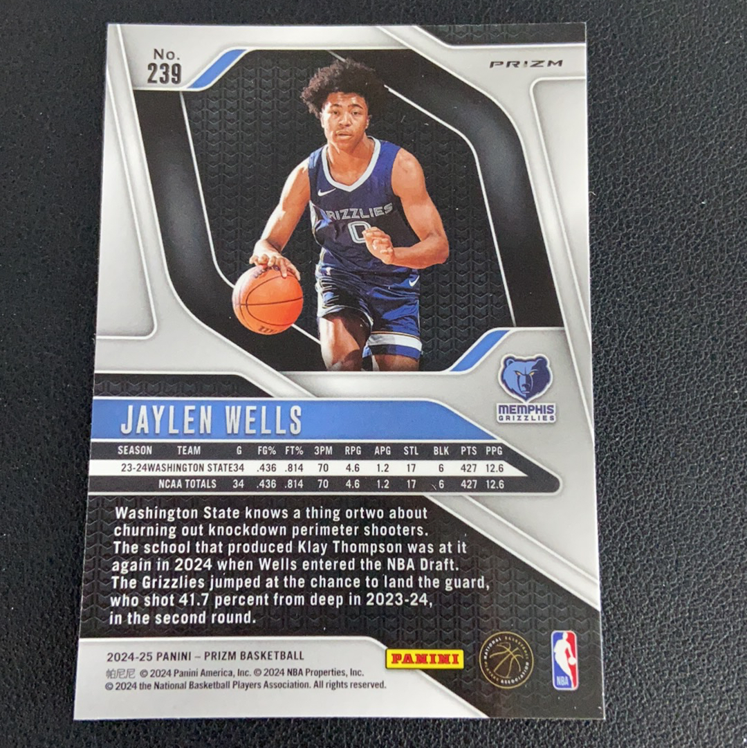 2024-25 Panini Prizm Jaylen Wells 【9527拍卖】 PZ 灰熊 杰伦威尔斯 新秀RC 正银折 卡品如图