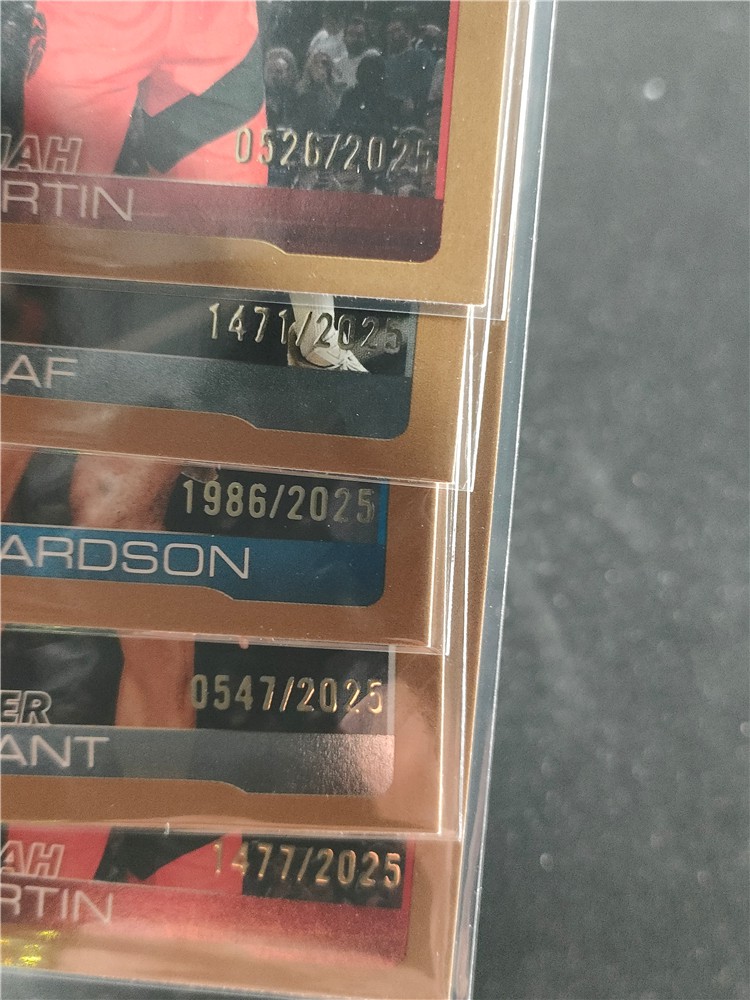 因卡淘系统不支持跨号合并,所以分开发货计算邮费,寄售代卖咨询:laauction。卡品如图,请仔细看图,如果无图片特殊展示瑕疵均为通行品相,一般prizm optic 等系列薄卡的小划痕,国宝IMM等系列厚卡的小白边小白角,都属于通行品相。艺术家 品控勿扰。中标后请等我们合并订单再点确认付款。付款时卡淘留言说明累计或邮寄,避免纠纷只发卡淘默认地址(我们会按照留言的先后顺序处理发货,请不要反复留言以免耽误给您回复)为了方便结算和卡片的累计查找,我们只合并当天的订单。邮费-顺丰(默认陆运):北京13元,非偏远外地18元,新疆西藏等偏远只发到付!超重只发到付!1000元以上的订单,建议买家自行保价,或用顺丰到付,所有快递未经保价,运输途中的损坏和丢失请于快递联系解决。(本店不支持任何普快发货,破损及丢失率太高)介意勿拍!中标可累计,累计时间2个月,每标累计金额不能超过500元,超过累计时间出现丢失或品相问题的,卡片问题由买家自行承担。累计的卡片请先付清卡款,然后卡淘上与我们联系操作,请于截标后3天转好,截标后5天未确认收到付款,一律卡淘投诉处理。
