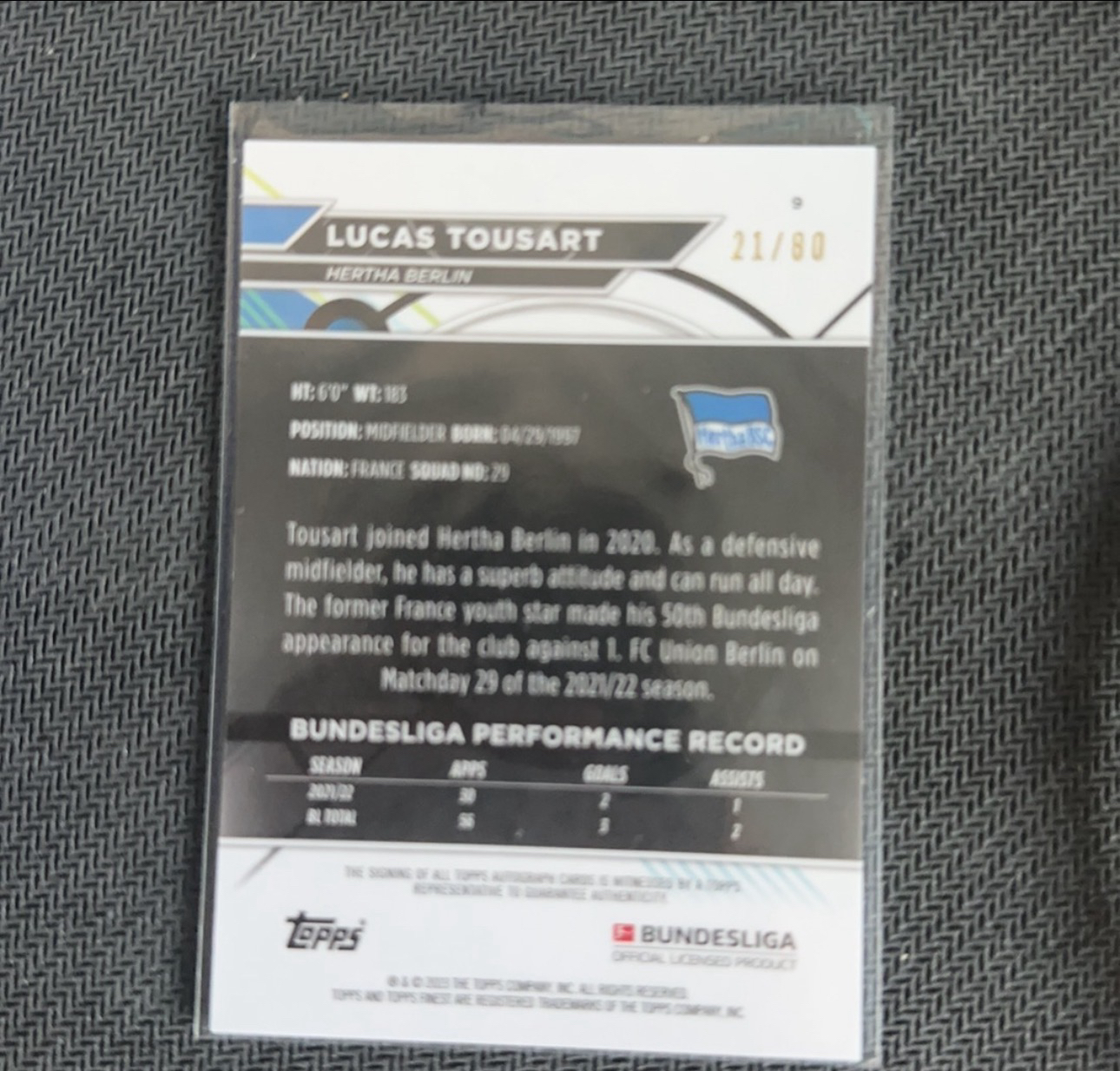 2023 Topps Finest Lucas Tousart 卢卡斯 图萨特 法国 布雷斯特 柏林赫塔 德甲finest 紫波纹 签字 60编 hx