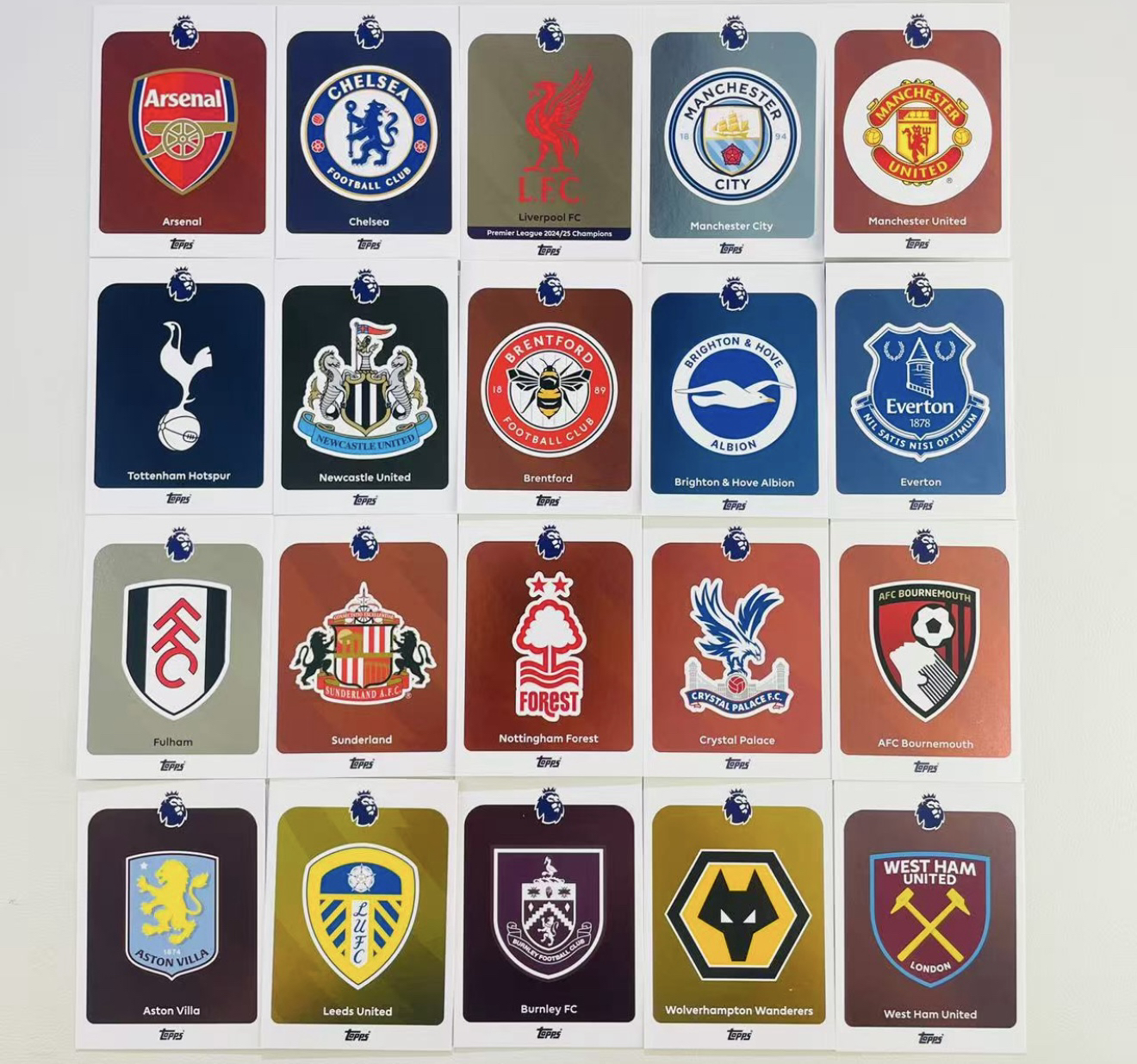 2025 topps premier 英超 伯恩利 水晶宫 纽卡斯尔联 阿斯顿维拉 富勒姆 埃弗顿 热刺 桑德兰 切尔西 利物浦 阿森纳 曼城 曼联 等20张队徽 全套打包 base 不重复