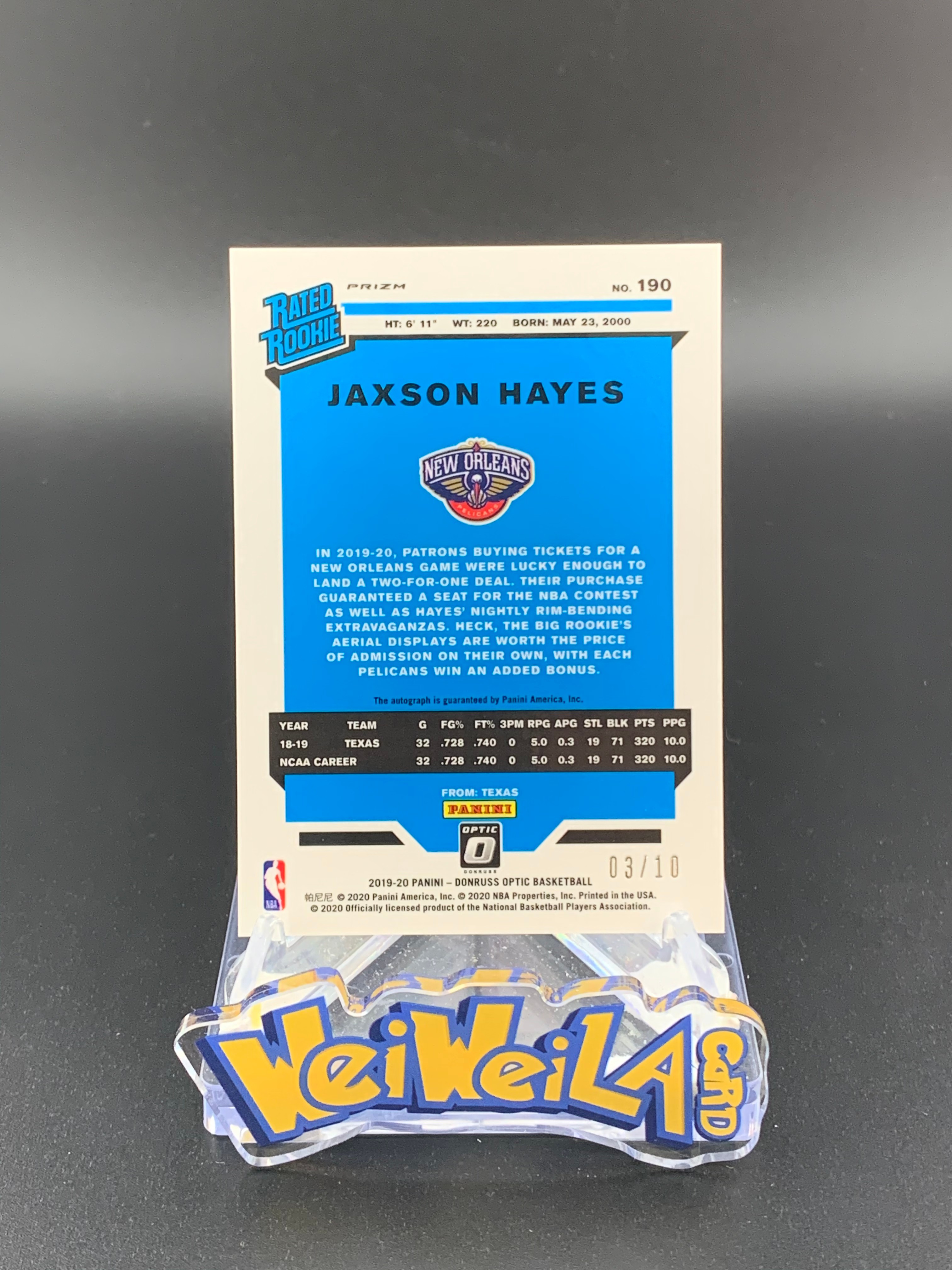 【微微辣代卖】D1-18扣扣哥 2019-20 Panini Donruss Optic 杜蕾斯OP Jaxson Hayes 鹈鹕 新秀RC 贾克森海斯 新秀金折签字 卡签 03/10编
