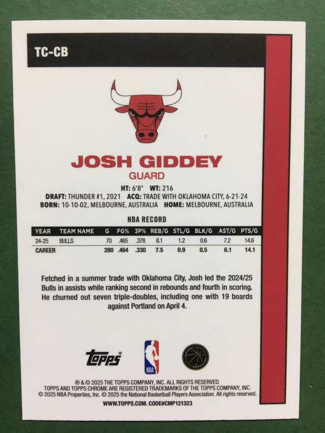 2025 Topps Chrome Josh Giddey tc 元年 公牛 约什 吉迪 mojo折 迷宫折 折射 base 雷霆 最年轻三双先生 亚历山大队友 新赛季爆发 未来可期 卡品如图#纪