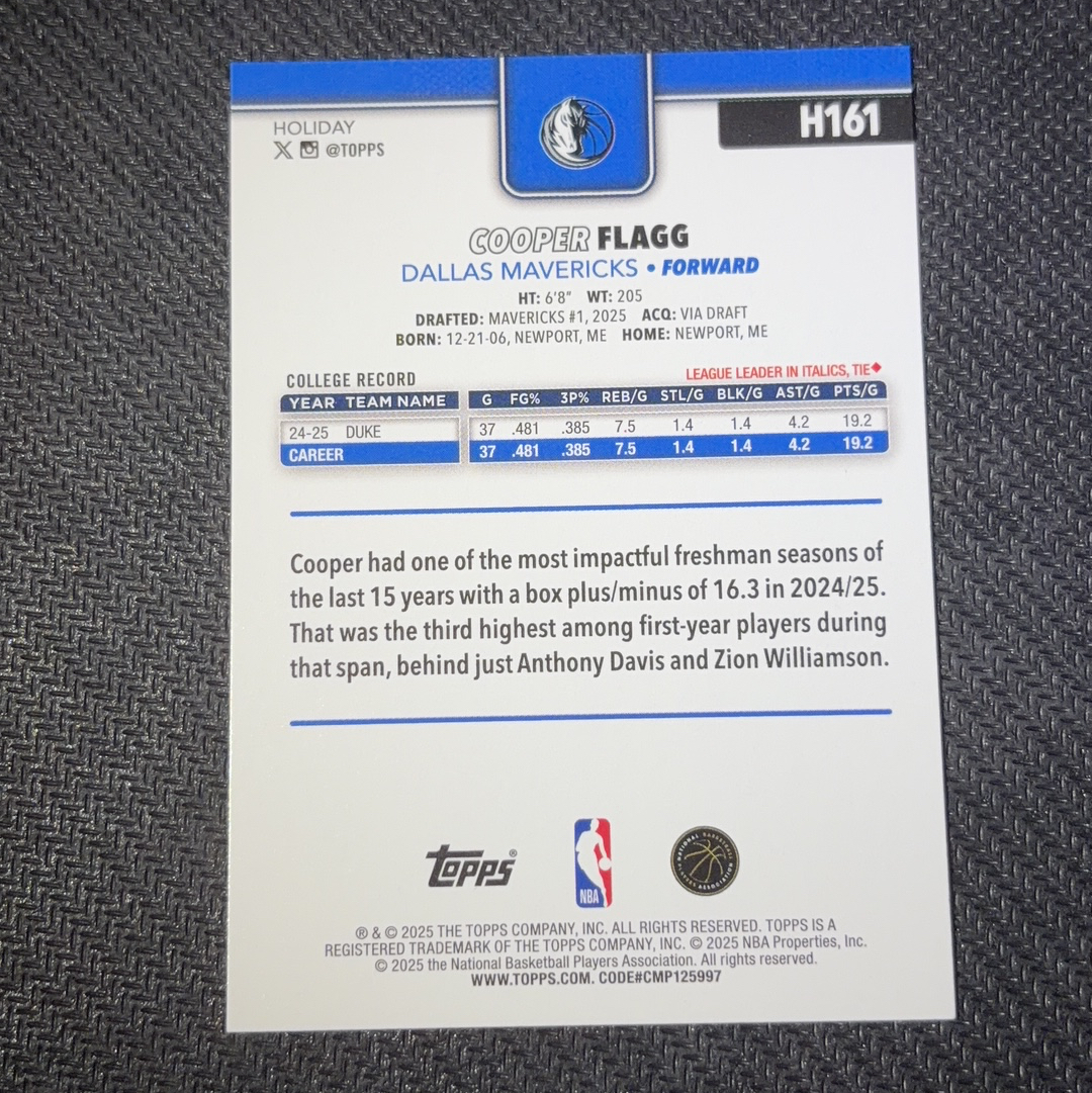 2025 Topps Happy Holidays Cooper Flagg RC 独行侠 库珀 弗拉格 新秀 状元 美国之子 base 实卡精美 收藏必备 专收 凑套 卡品如图 未来可期