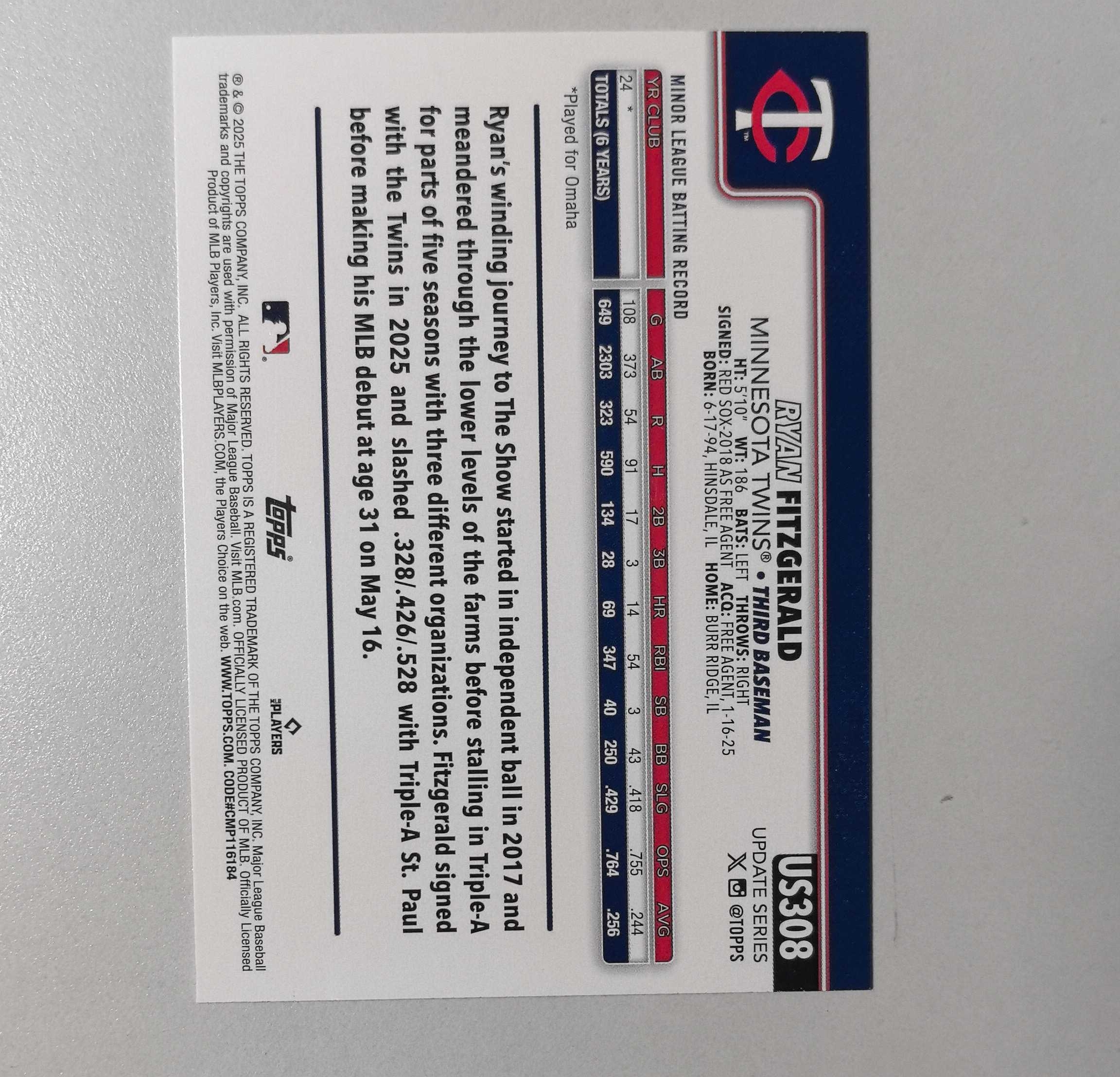 2025 Topps 【锡安代卖】 累计照常 棒球mlb series update 大比例ssp无字平行 明尼苏达双城热门新秀 Ryan Fitzgerald 卡品如图 飞机盒