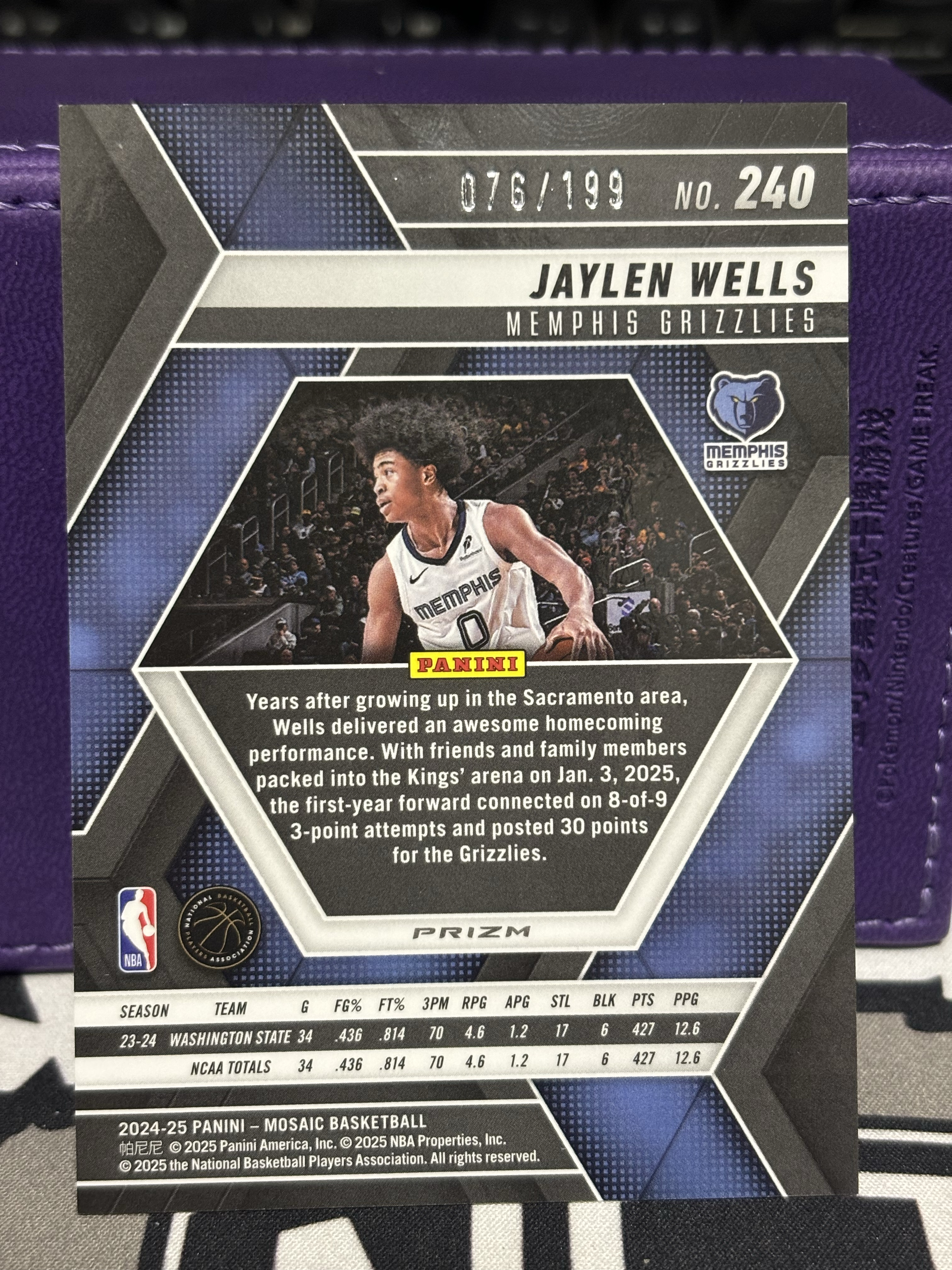 2024-25 Panini Mosaic Jaylen Wells RC 马赛克 灰熊队 杰伦 威尔斯 新秀 199编蓝折 076/199编蓝宝石折 贾 莫兰特队友 斯蒂芬 卡斯尔同届 不保卡品