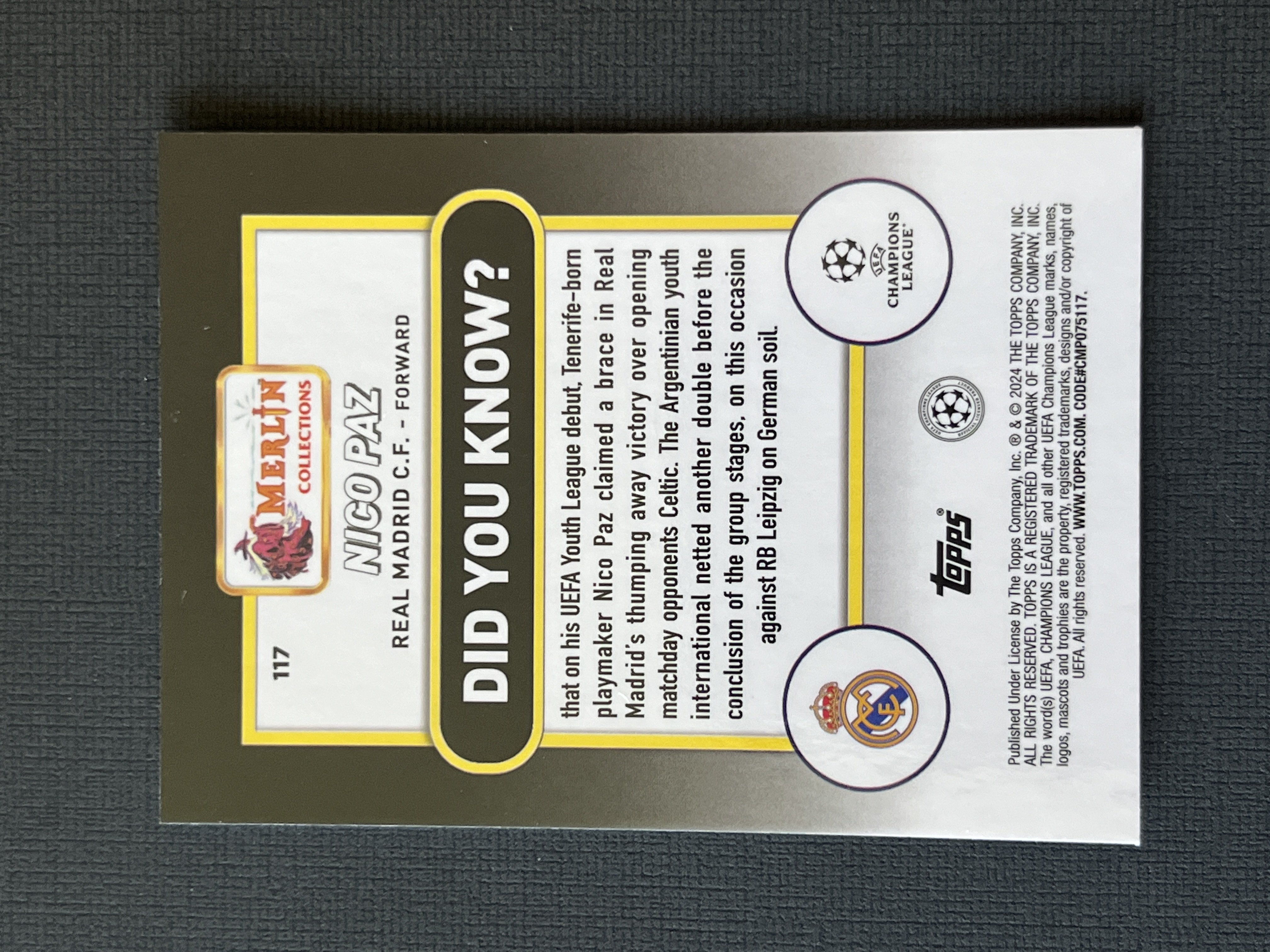 2024 Topps Merlin Nico Paz RC #117 梅林欧冠 尼科帕斯 皇家马德里 新秀base