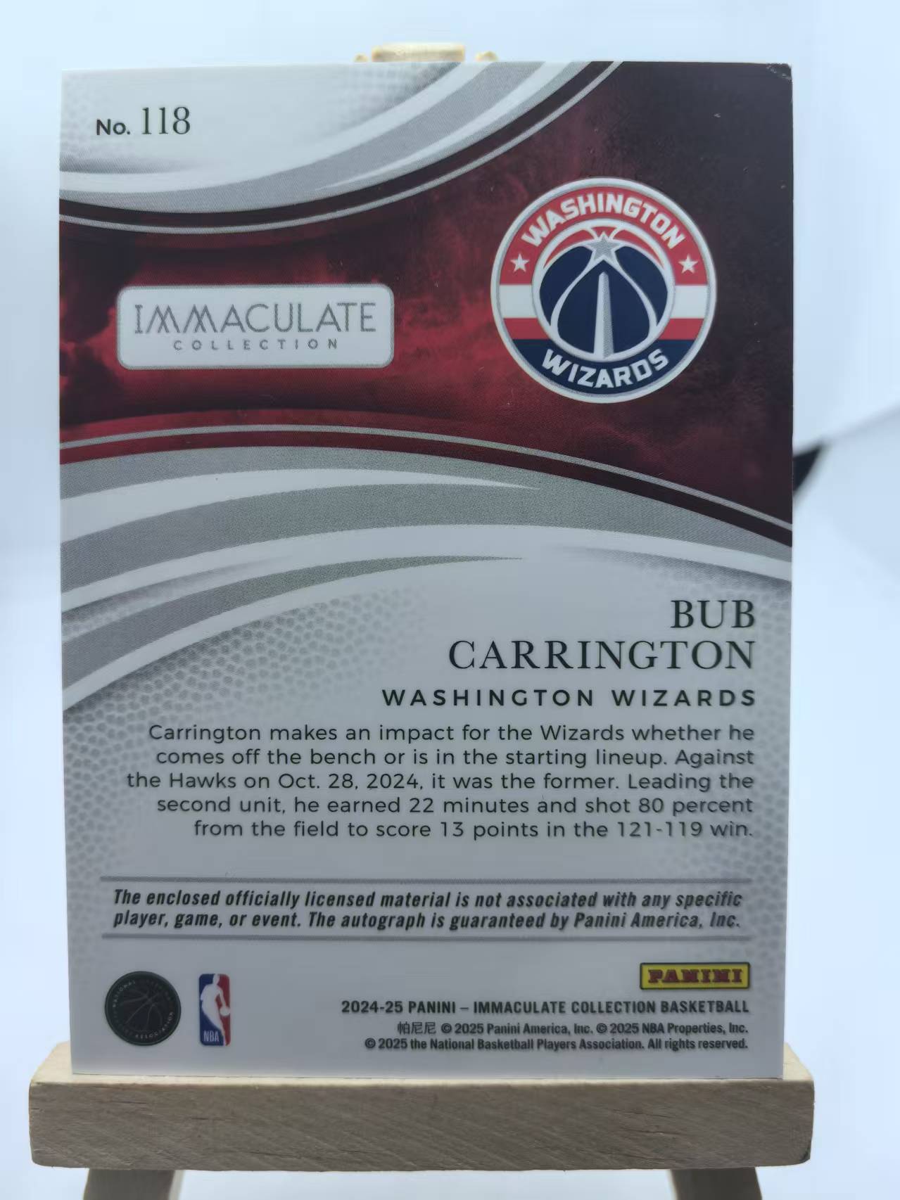 2024-25 Panini Immaculate bub carrington RC 卡林顿 卡灵顿 奇才 新秀 64/99 编 RPA 签字 卡签 三色暴力切割 卡品如图