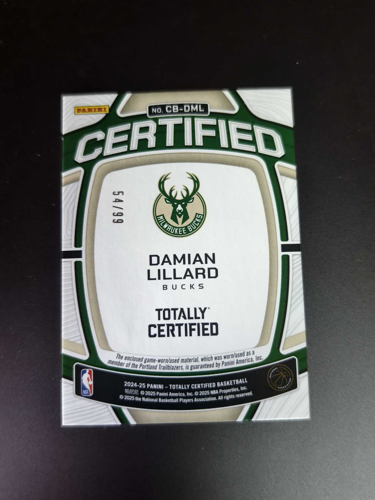2024-25 Panini totally certified Damian Lillard 达米安 利拉德 物料 雄鹿 54/99编 卫生巾 专收必备