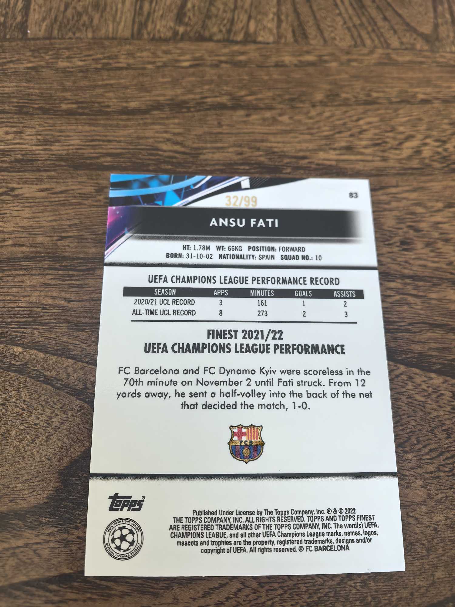 2022 Topps Finest Ansu Fati 巴萨前金童#法蒂99编折射,卡品如图
