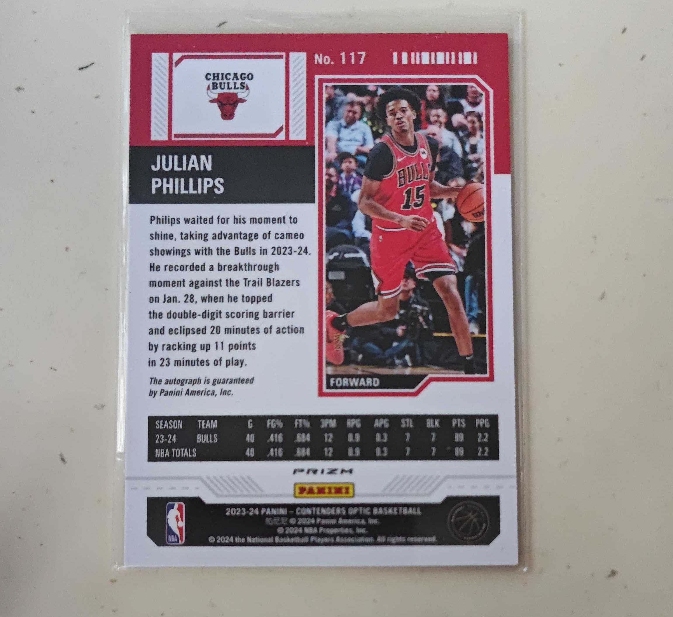 2023-24 Panini Contenders Julian Phillips RC 朱利安 菲利普斯 新秀 球票 银折 折射 Sliver 卡签 签字 公牛 专收必备