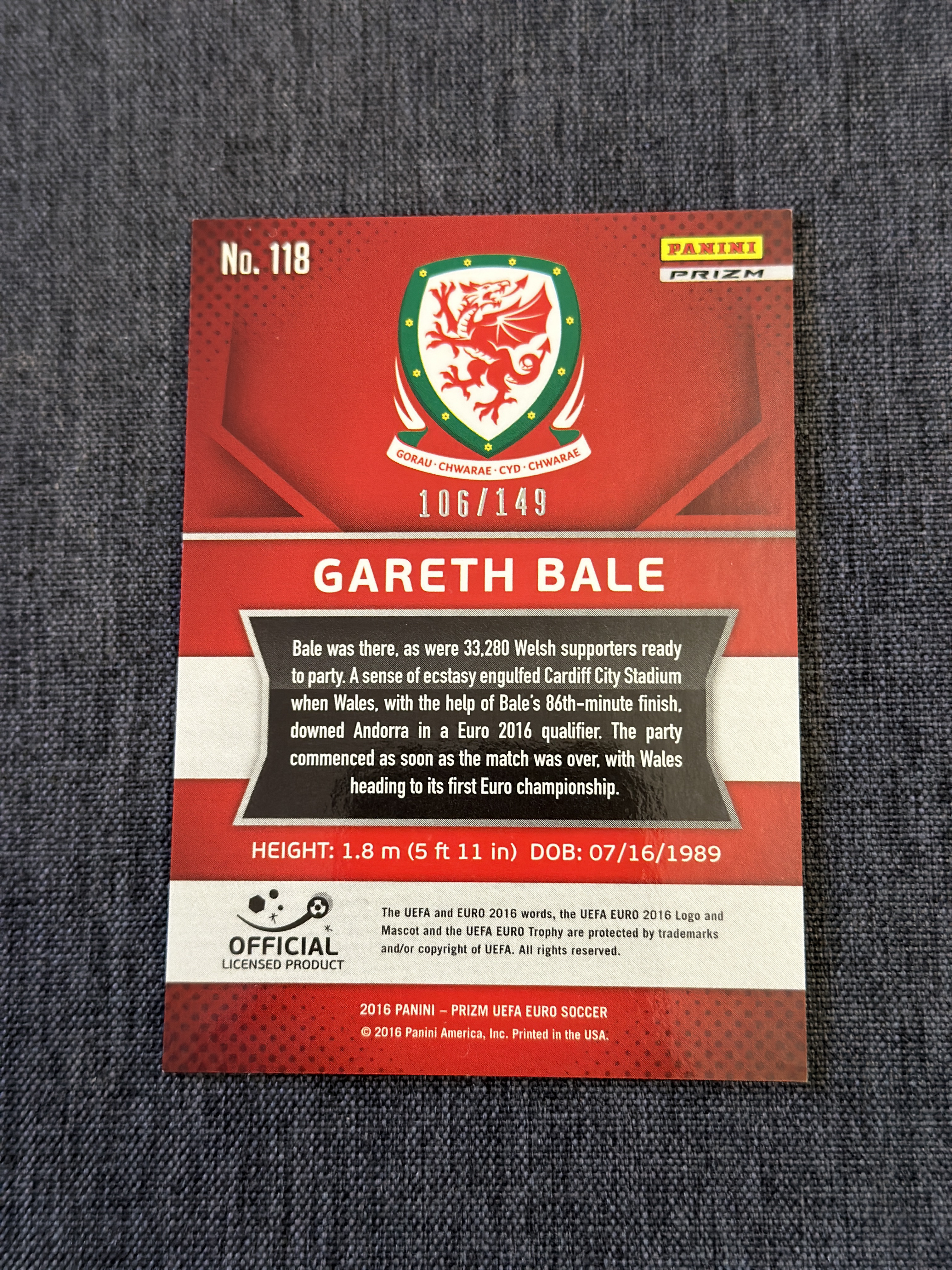2016 Panini Prizm UEFA Euro Gareth Bale 元年 欧洲杯 PZ 加雷斯 贝尔 106/149编 红折 红平行 Colormatch 威尔士 热刺 皇马 大圣【FR】