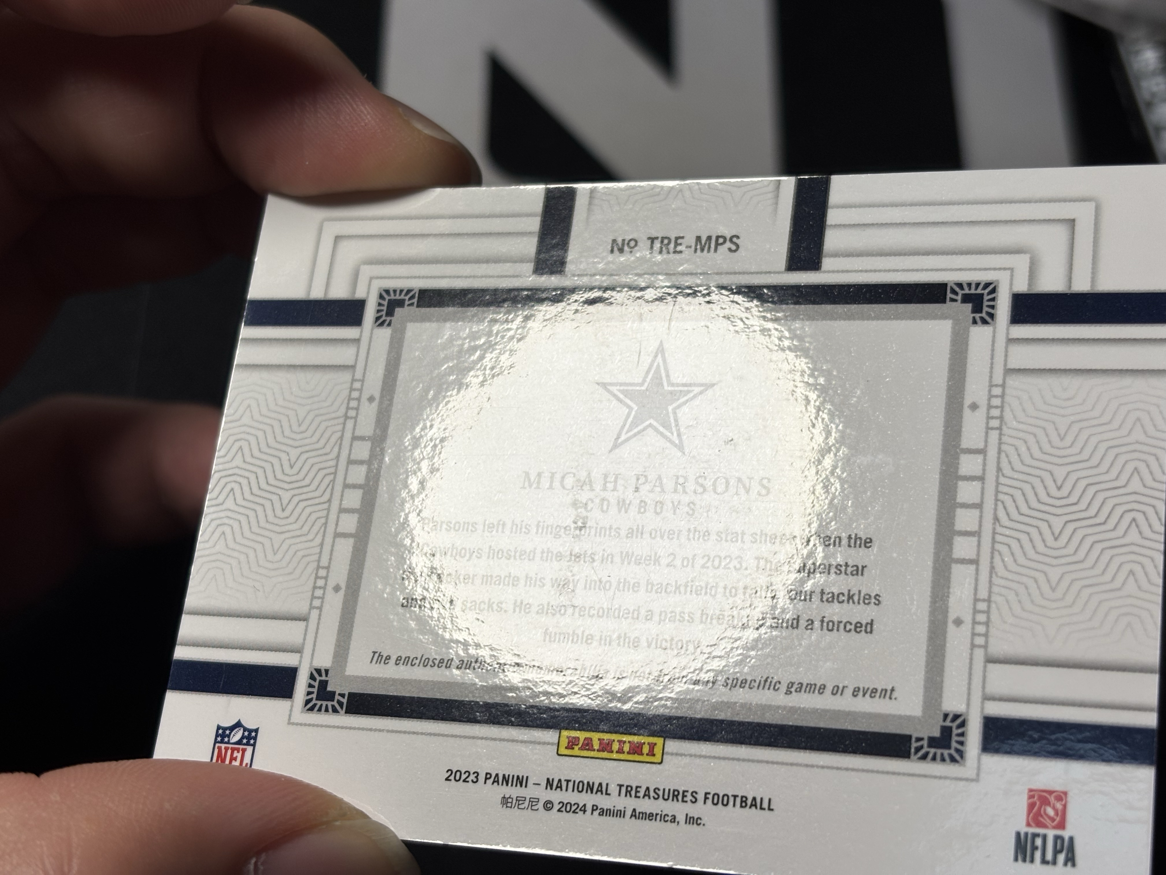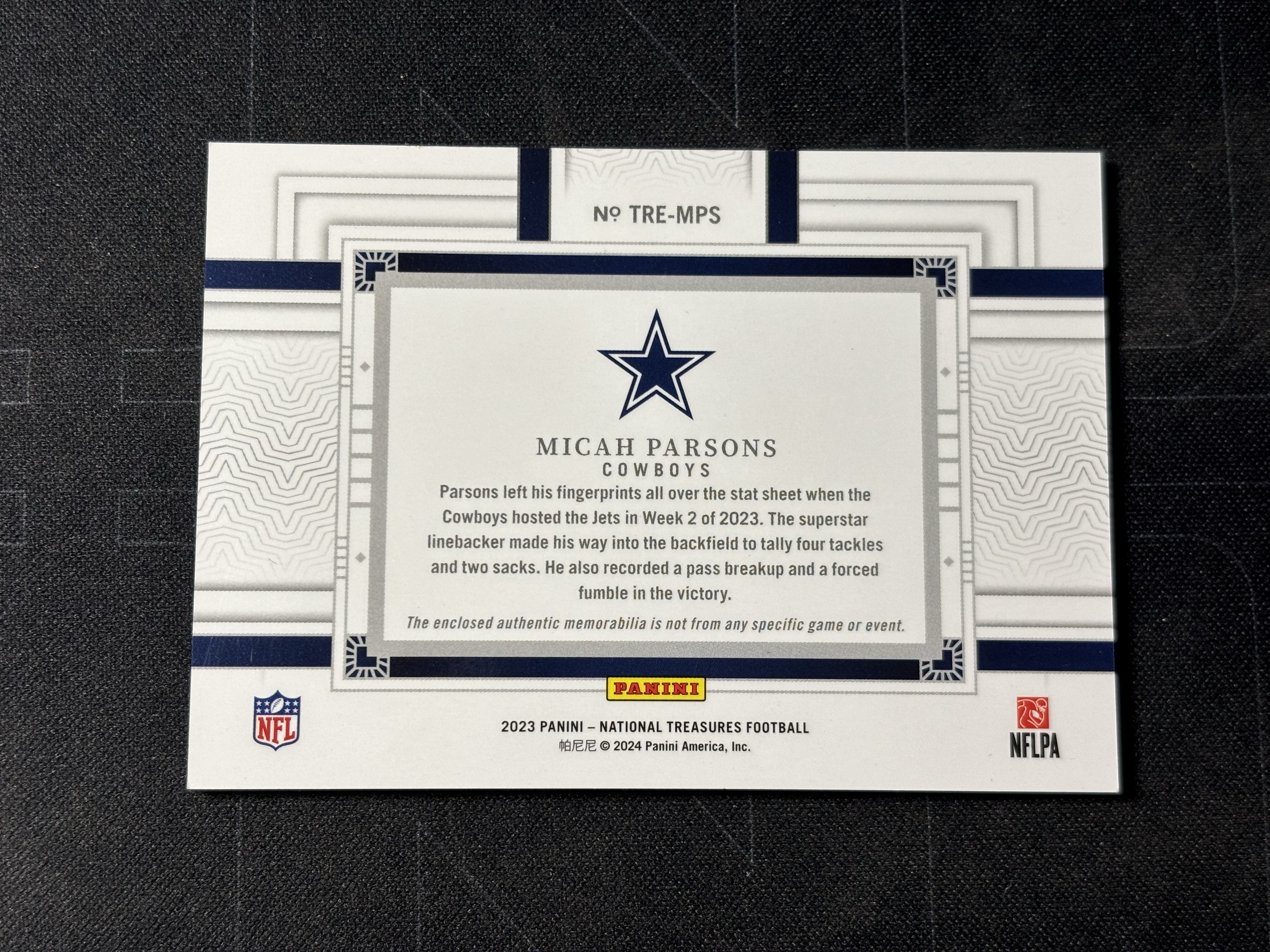 【香山拍卖】2023 帕尼尼 National Treasures 国宝 橄榄球 NFL 牛仔队 Micah Parsons 米卡 帕森斯 38/49编 大窗球衣切割 实卡好看 卡品微瑕如图