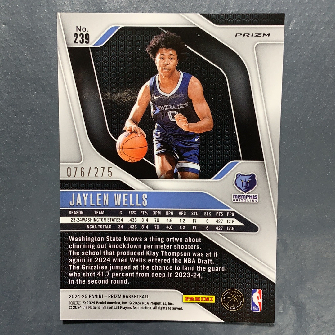 2024-25 Panini Prizm Jaylen Wells RC Prizm 杰伦 威尔斯 RC 新秀 白镭射折 275编 灰熊