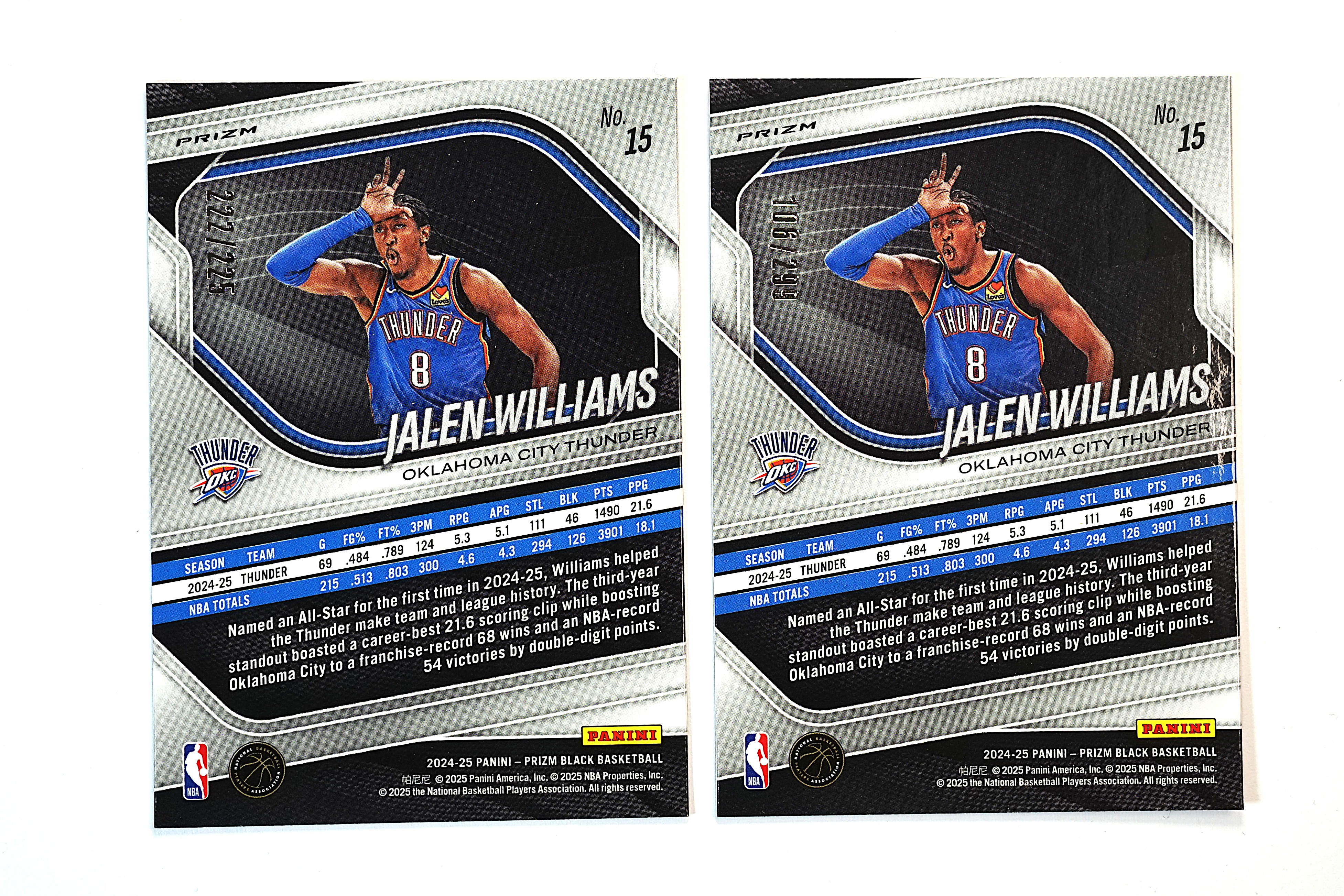 2024-25 Panini Prizm Black Jalen Williams 杰伦 威廉姆斯 225编 299编 球皮折 红折 雷霆 老八 招牌动作 一图2张一起拍 Lot不保卡品【DD】