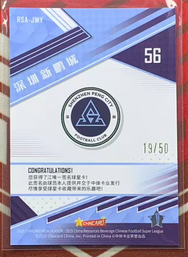 2025 中体卡业 CSL NEW SEASON(新赛季) 江唯一 RC 1st 中超新赛季 新秀 明日星 签字 卡签 深圳新鹏城 19/50编 银折 折射