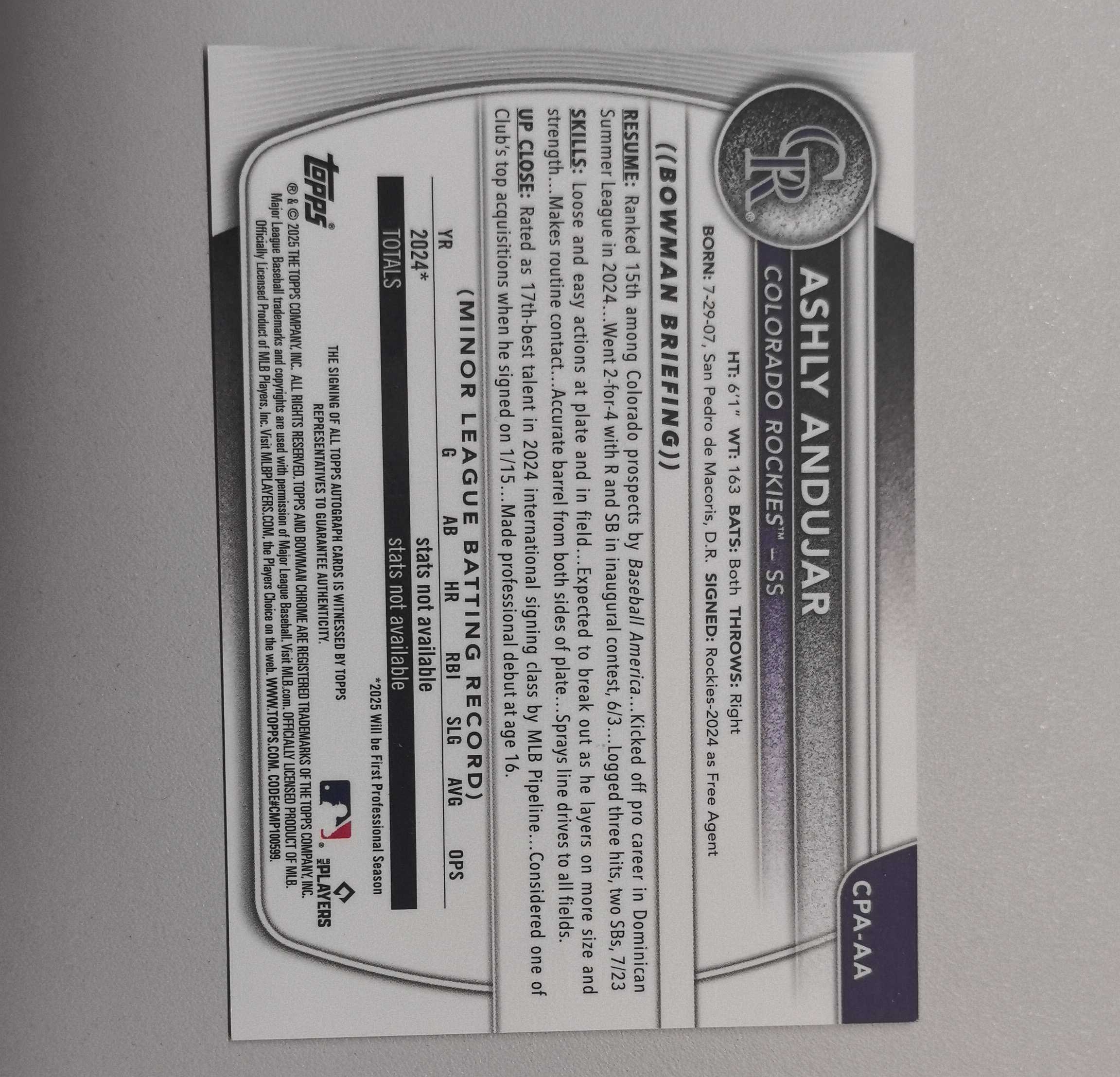 2025 Topps 【锡安代卖】 累计照常 棒球mlb bowman 1st新秀签字卡签 碎点折299编 科罗拉多洛基热门新秀大物 Ashly Andujar 卡品如图 卖卡锡