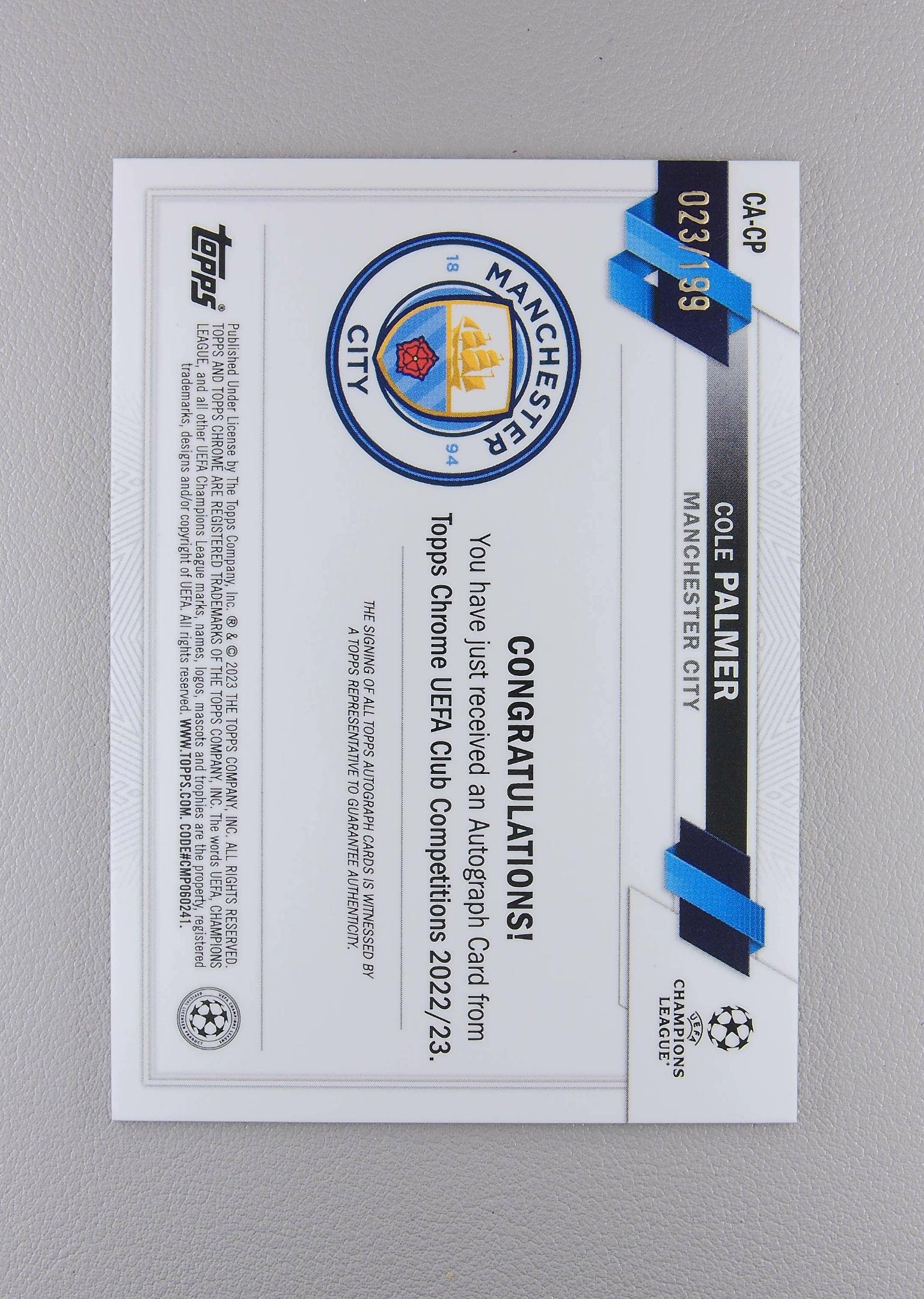 2023 Topps Chrome Cole Palmer 帕尔默 帕尔莫 199编 曼城 英格兰 切尔西 签字 正TC 战神无双拍卡 (#11.17xuan)