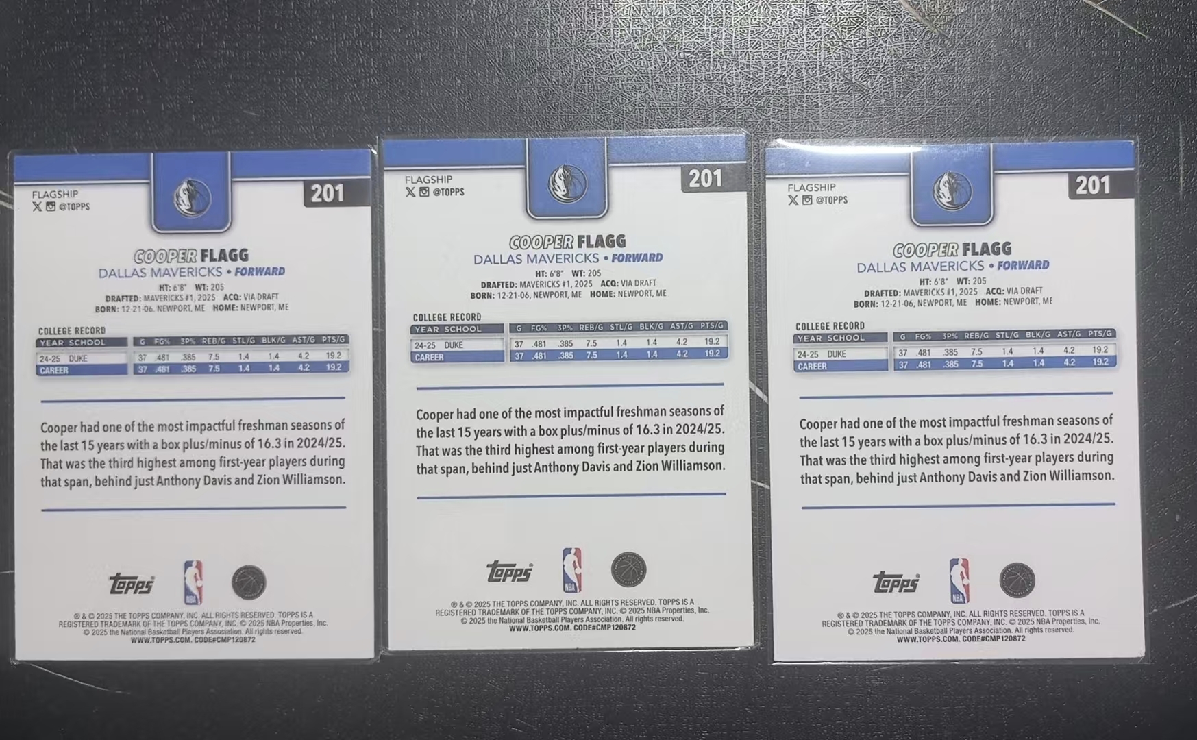 2025-26 Topps Basketball Cooper Flagg RC 独行侠 库珀 弗拉格 竖版base 新秀 三张lot打包出售!性价比拉满 投资收藏必备!未来联盟门面