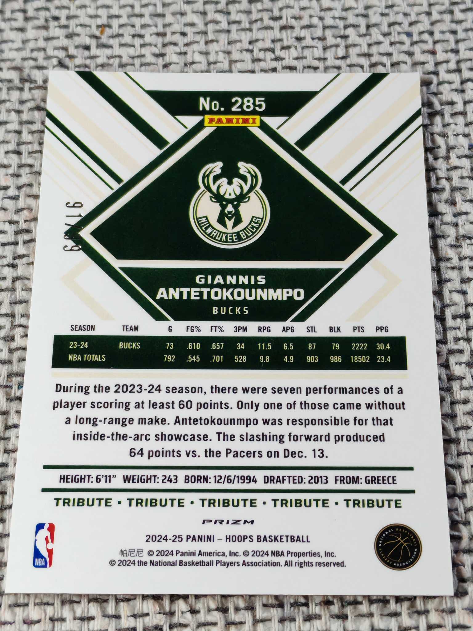 2024-25 Panini NBA Hoops Giannis Antetokounmpo 扬尼斯 字母哥 红折 /99编 超低编 YeZi代卖 雄鹿队