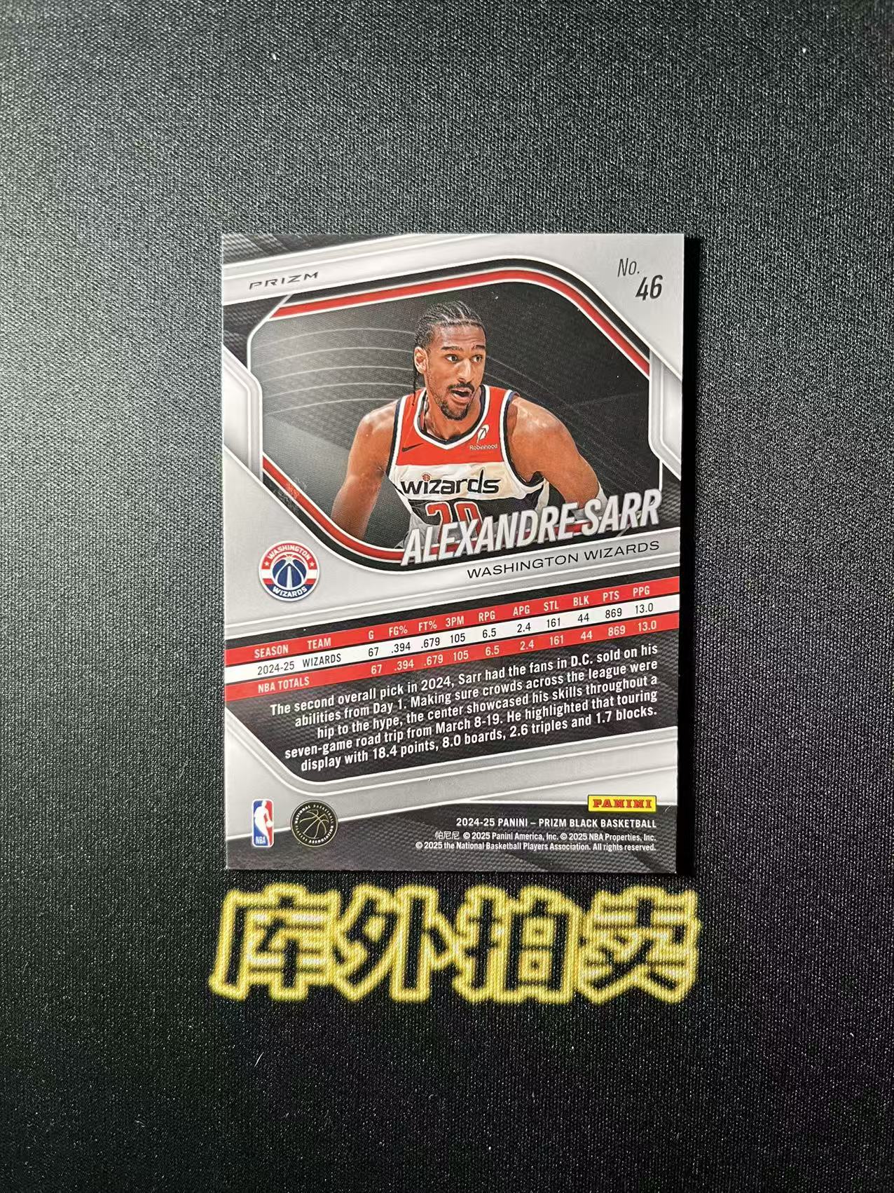 2024-25 Panini Prizm Alex Sarr RC 奇才 亚历山大 萨尔 Prizm Black系列 新秀 银折 正银 RC 折射 投资必备 卡品如图 未来可期 Gn