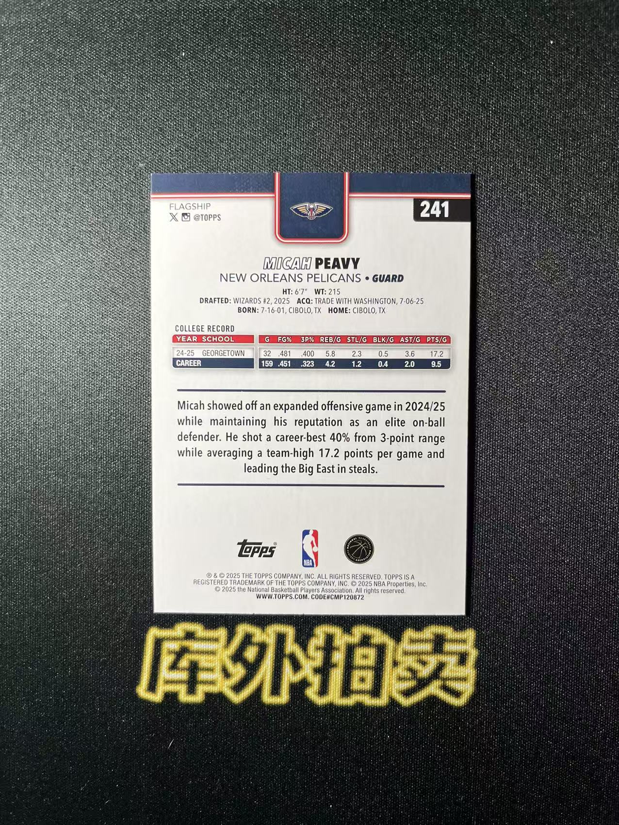 2025 Topps Flagship Micah Peavy RC 鹈鹕 迈卡 皮维 旗舰系列 新秀 150编 蓝折 007/150编 正新秀卡 带编 折射 卡品如图 未来可期 Gn