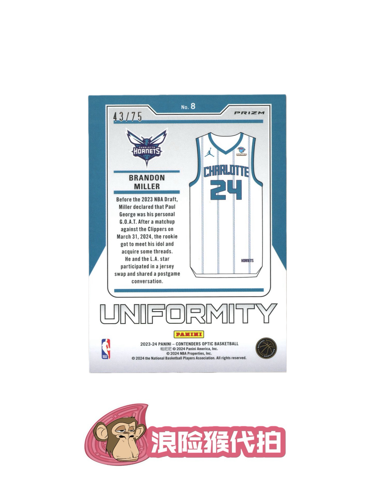 【浪险猴🐒代拍】2023-24 Panini 球票Optic Brandon Miller 黄蜂 布兰登 米勒 新秀RC 75编 球衣 小背心 特卡 蓝碎冰折 折射 微瑕如图 黎明