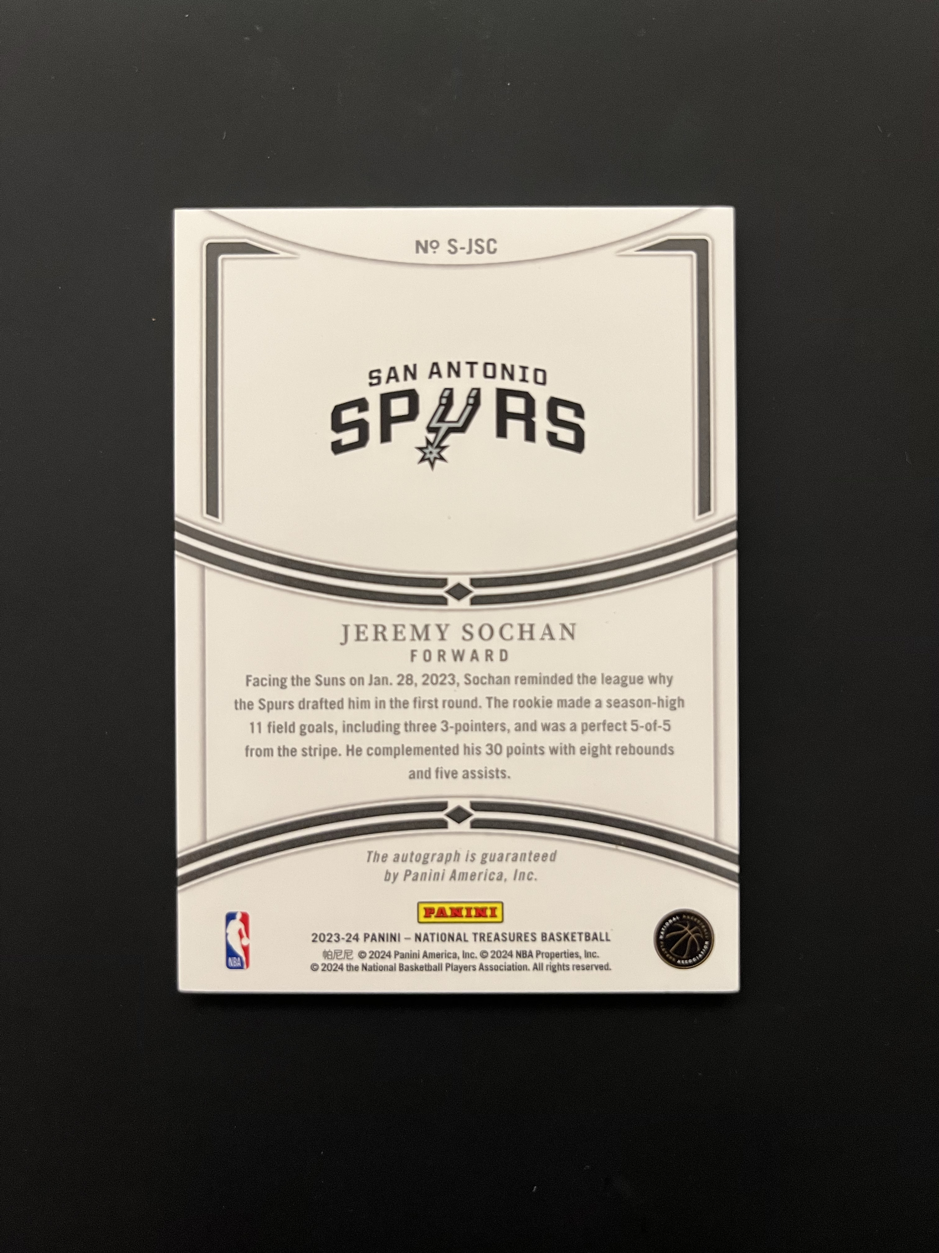 2023-24 Panini National Treasures Jeremy Sochan 国宝系列 马刺队 杰里米索汉 签字 卡签 12/25编 卡品如图 肆