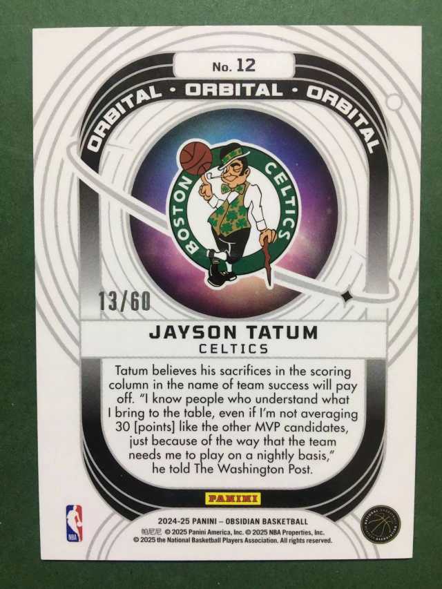 2024-25 Panini Obsidian Jayson Tatum 黑曜石 凯尔特人 杰森 塔图姆 獭兔 60编 铜折 折射 Orbital 轨道特卡 杰伦布朗队友 全明星 总冠军 卡品如图#冯