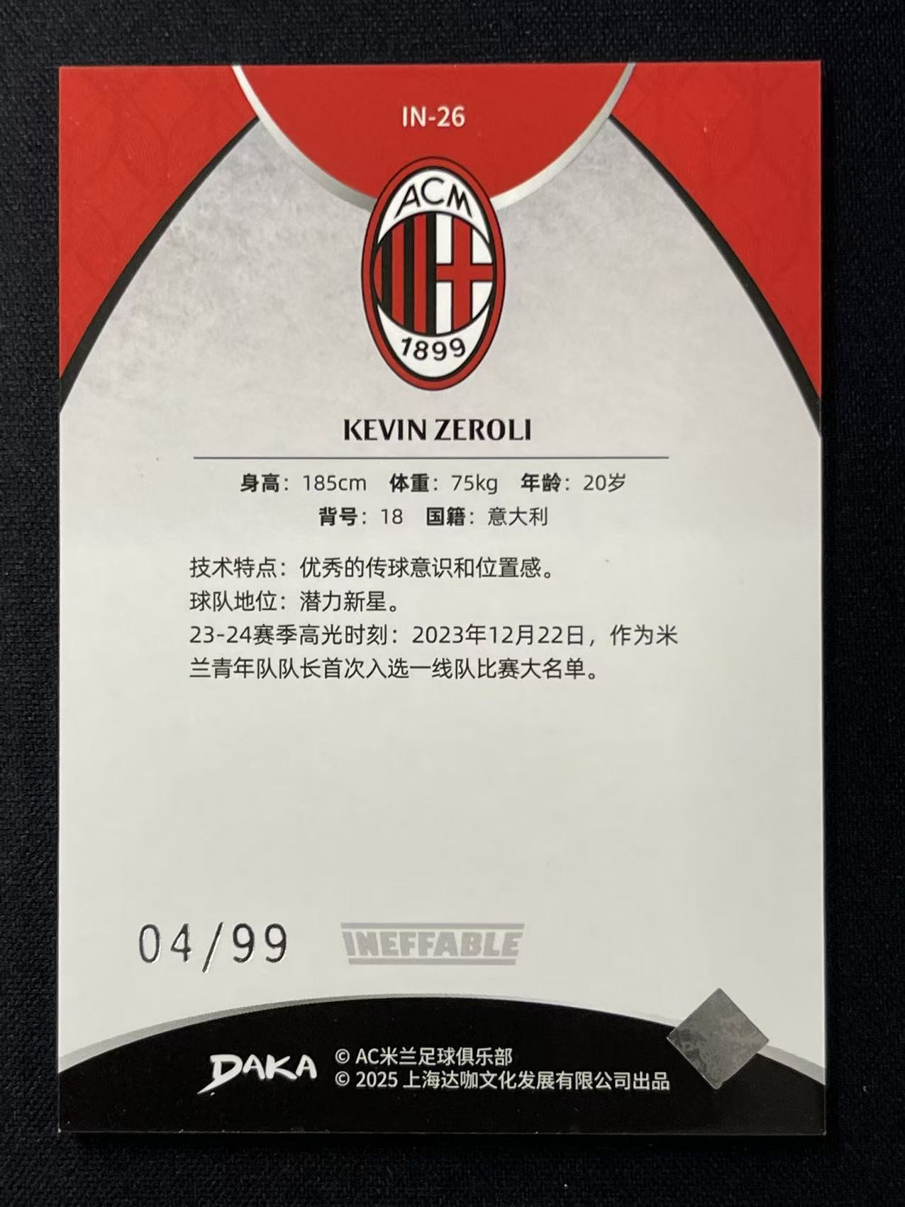 2024-25 DAKA AC米兰 MilanOne&Two队盒 Kevin Zeroli 泽罗利 Ineffable 厚卡Base 04/99编 银平行 IN-26 阿守