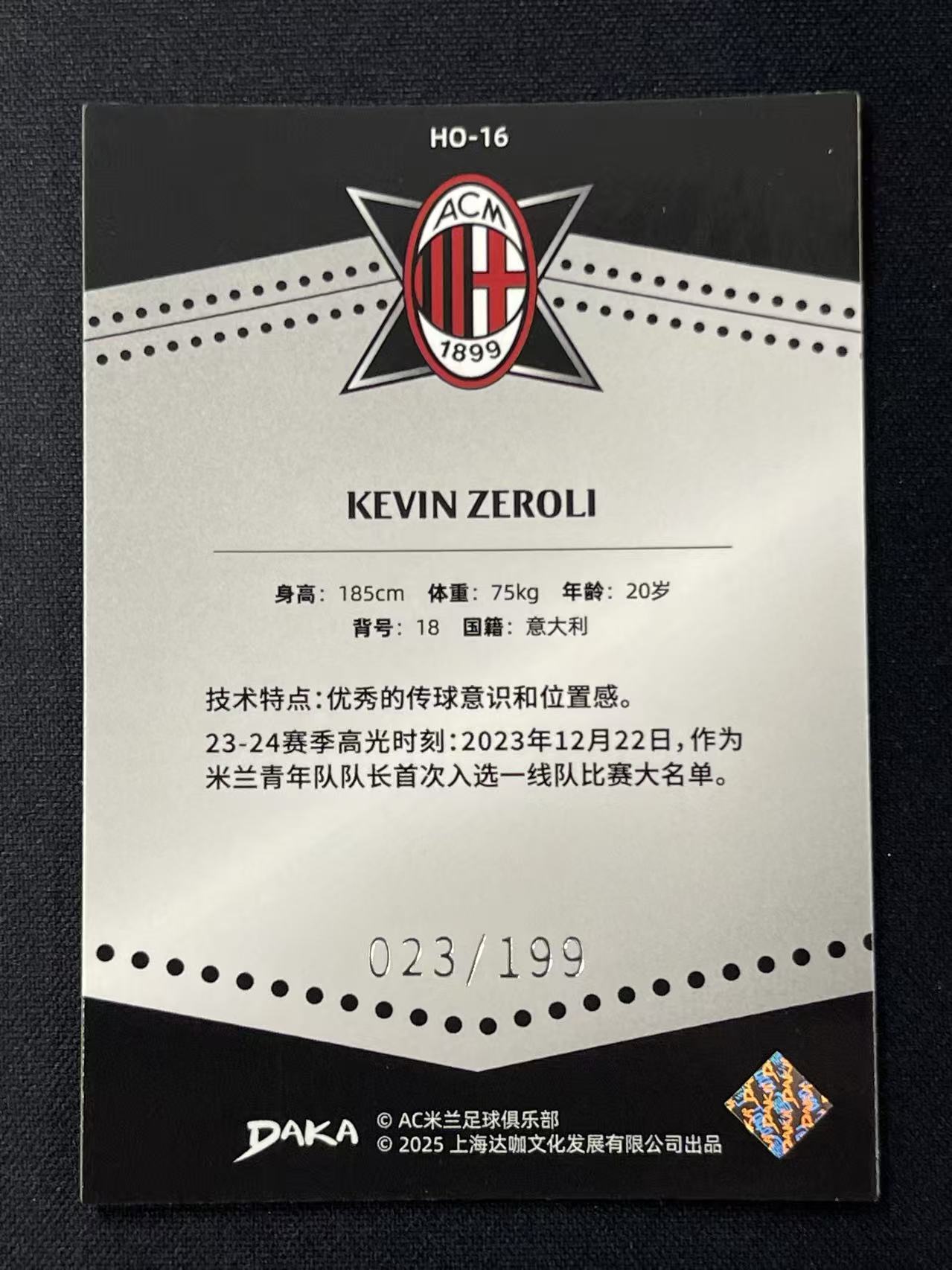 2024-25 DAKA AC米兰 MilanOne&Two队盒 Kevin Zeroli 泽罗利 Holocene Base 023/199编 银平行 HO-16 阿守