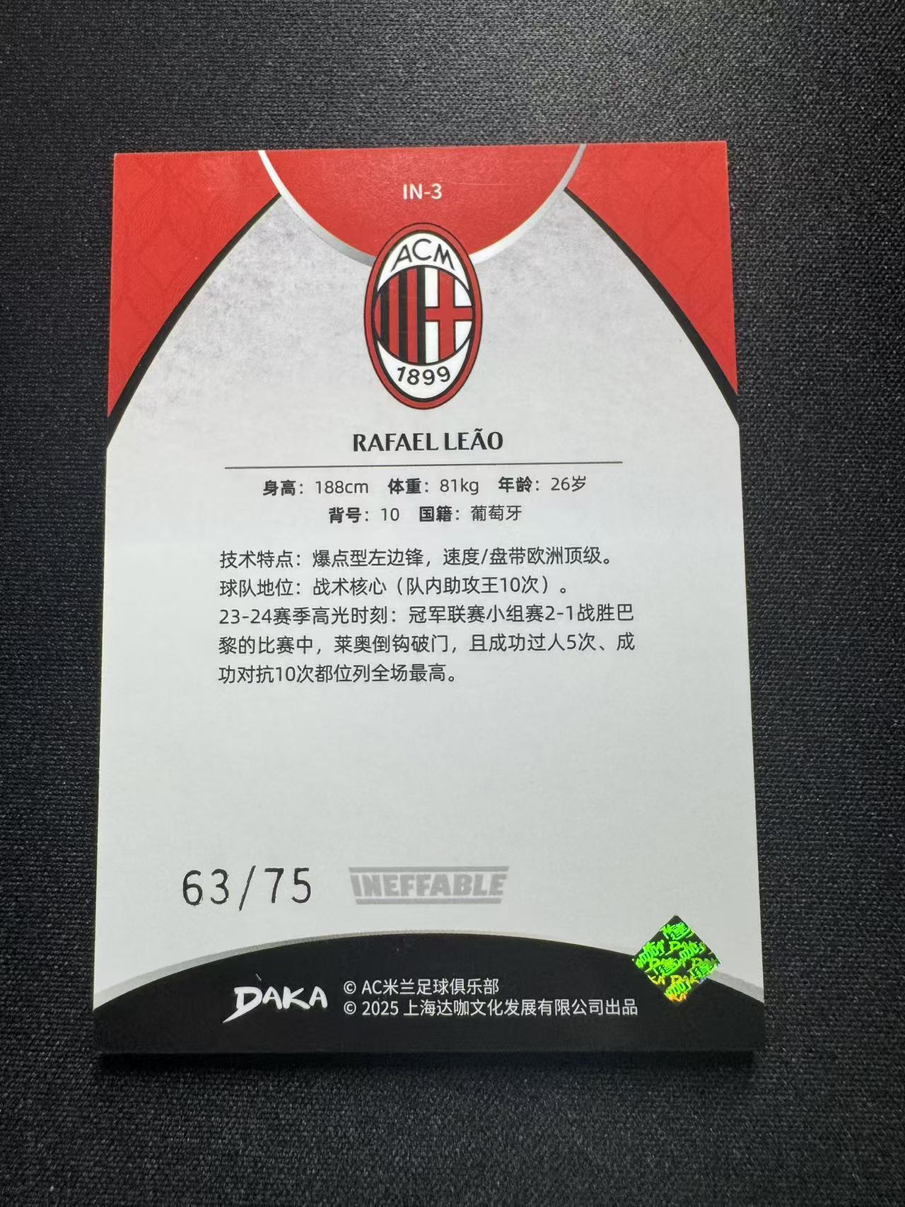2024-25 DAKA AC米兰 MilanOne&Two队盒 Rafael Leao 莱奥 勤笑公 葡萄牙 Ineffable 厚卡Base 63/75编 紫平行 IN-3 招财猫