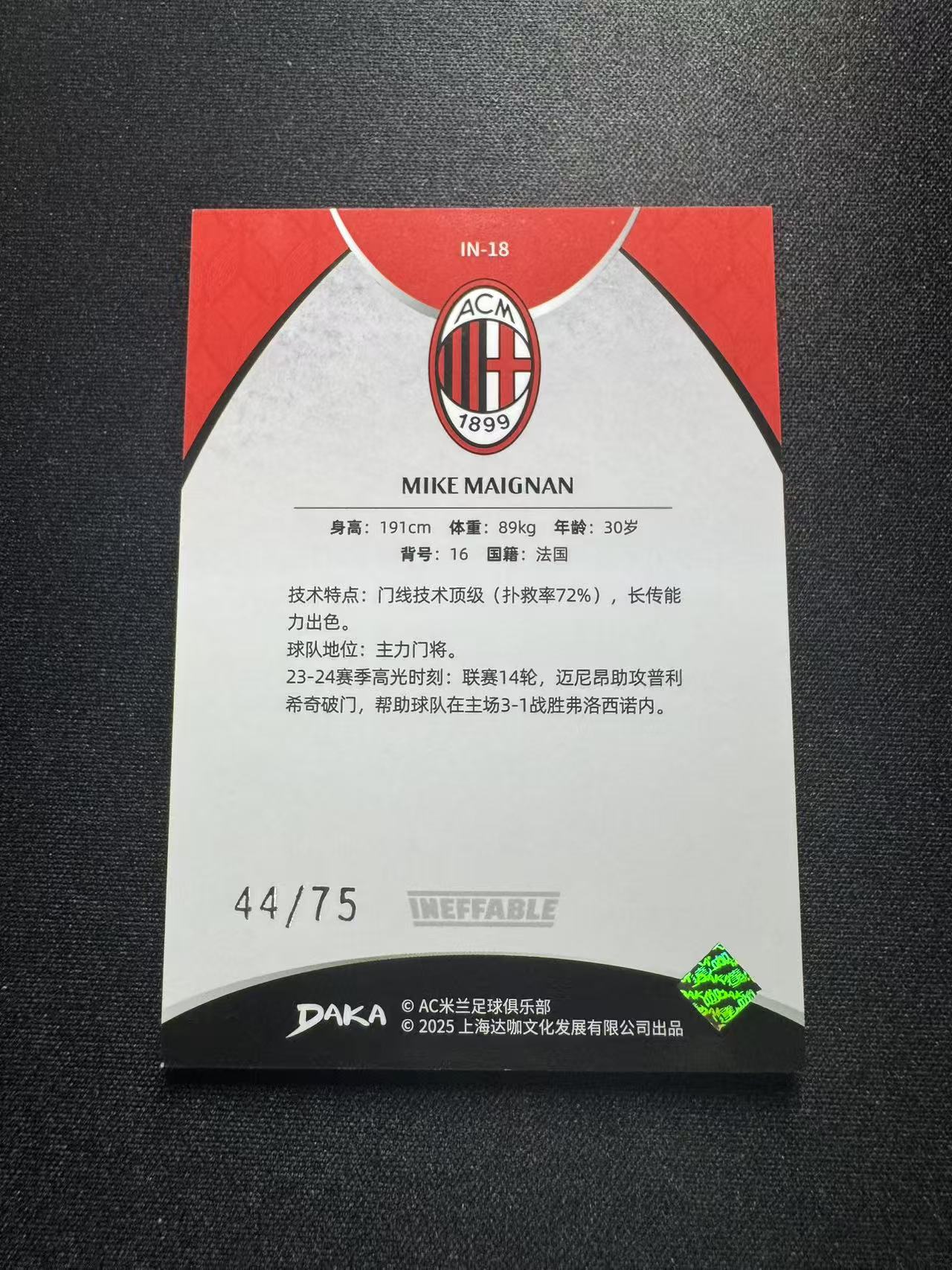 2024-25 DAKA AC米兰 MilanOne&Two队盒 Mike Maignan 迈尼昂 法国门神 Ineffable 厚卡Base 44/75编 紫平行 IN-18 招财猫
