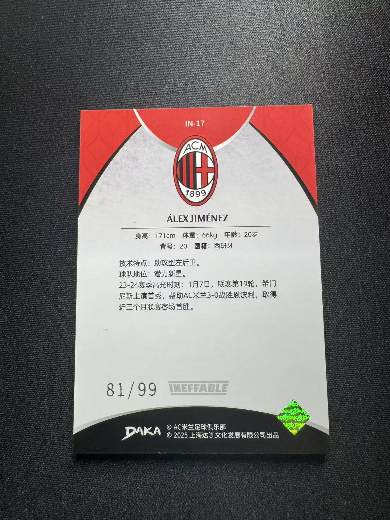 2024-25 DAKA AC米兰 MilanOne&Two队盒 Alex Jimenez 亚历克斯 希门尼斯  Ineffable 厚卡Base 81/99编 银平行 IN-17 招财猫