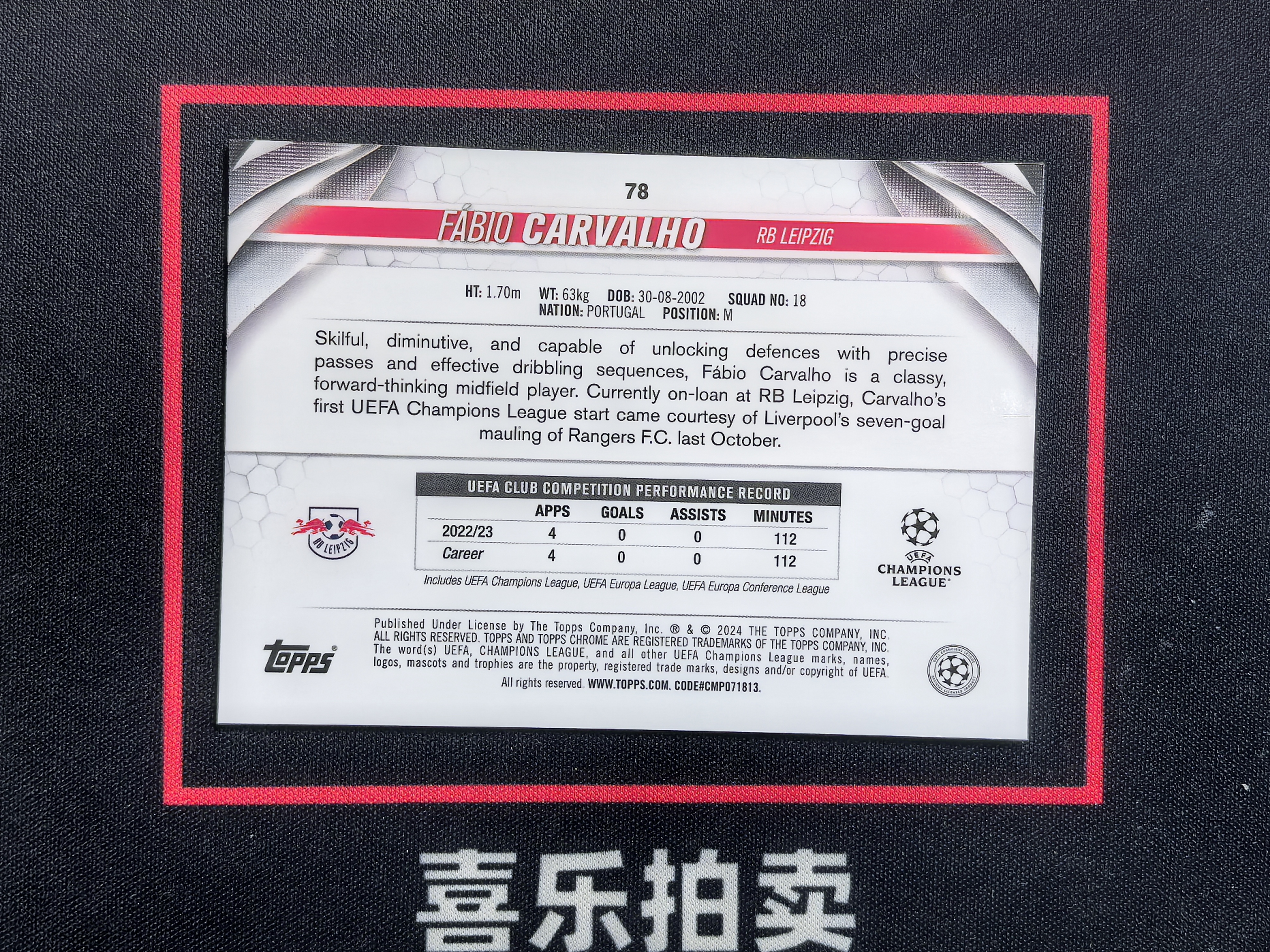 2024 Topps Chrome Fábio Carvalho 欧冠 欧战TC 莱比锡红牛 法比奥 卡瓦略 169/250编 粉马赛克折 折射 收藏必备 卡品如图 sjl