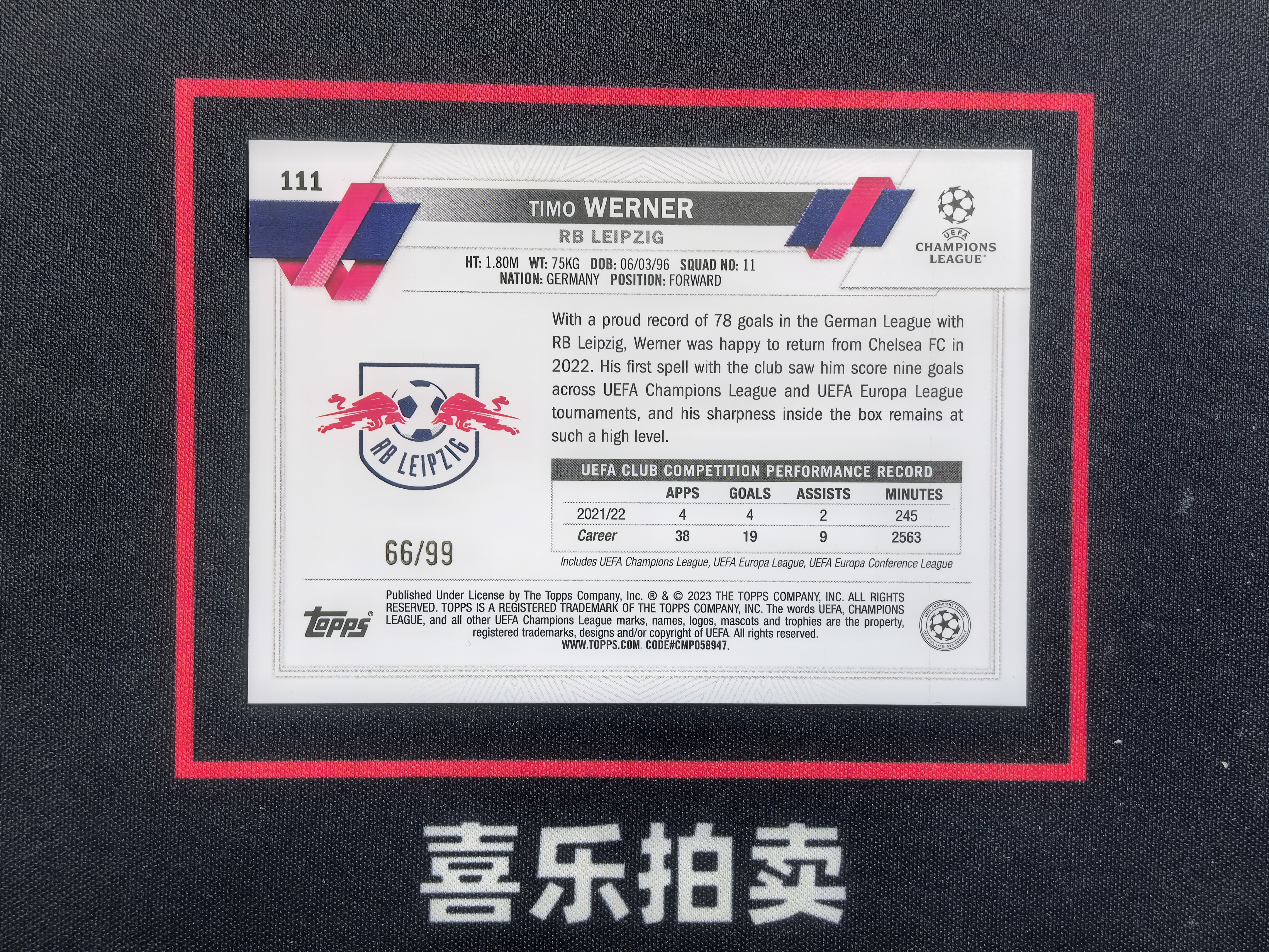 2023 Topps Chrome Timo Werner 欧冠 欧战TC 莱比锡红牛 蒂莫 维尔纳 66/99编 白碧玉折 折射 收藏必备 卡品如图 sjl