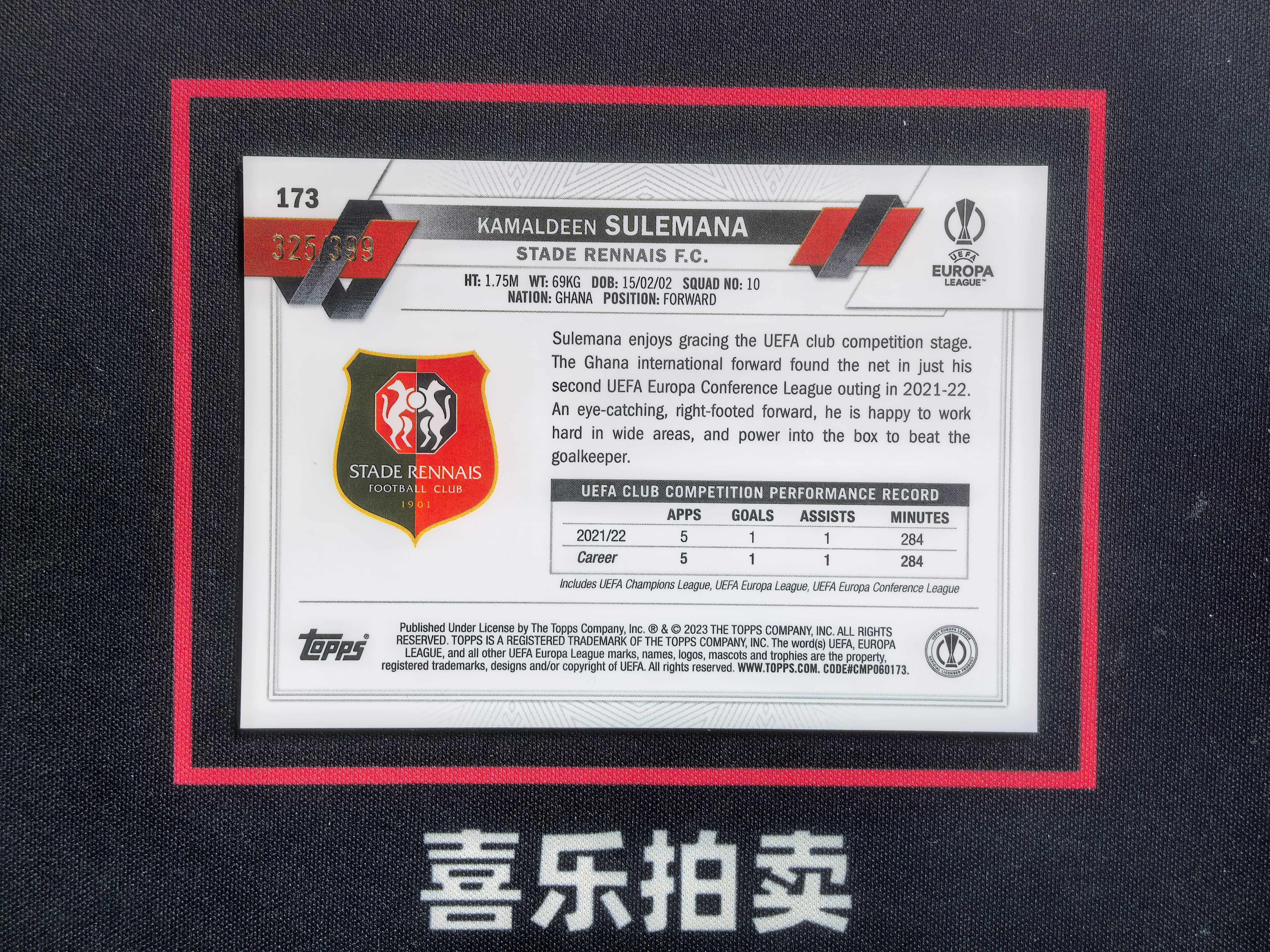 2023 Topps Chrome Kamaldeen Sulemana 欧冠 欧战TC 雷恩 苏莱曼纳 325/399编 绿shimmer折 折射 未来之星 收藏必备 卡品如图 sjl