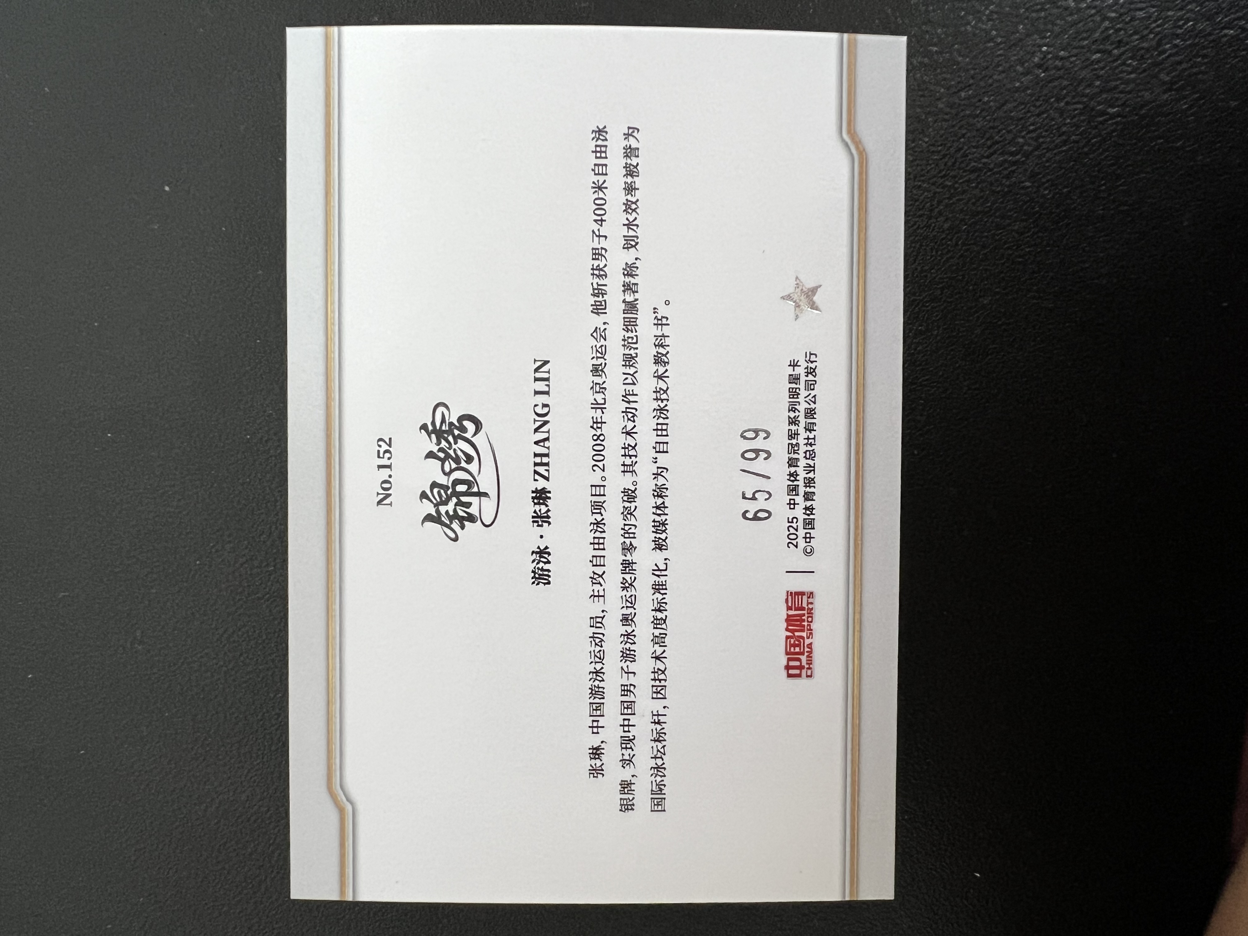 2025 中国体育CHINA SPORTS 锦绣 ZHANGLIN 65/99编 游泳·张琳 带编 特卡 BASE 完美收藏 卡品如图
