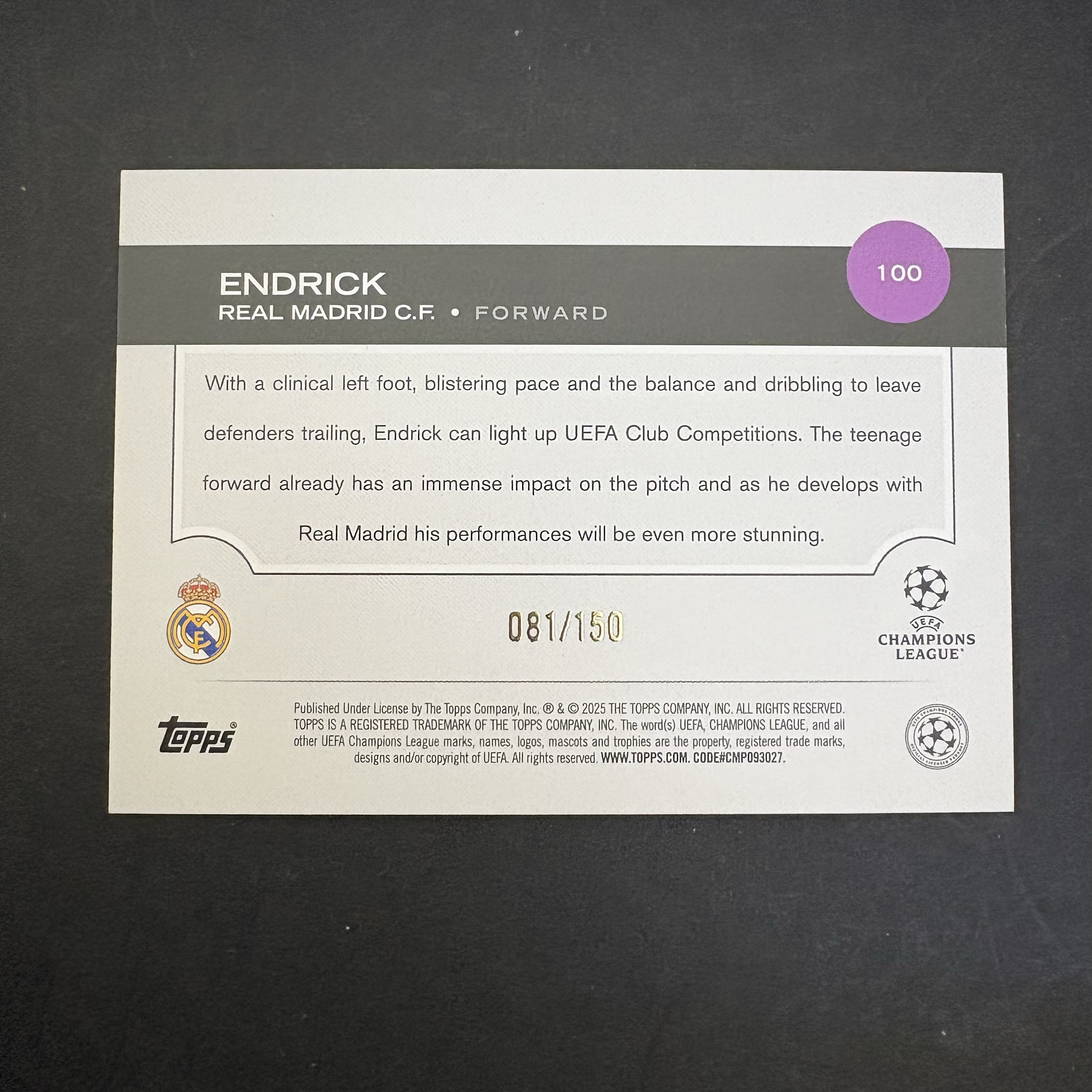 2024-25 Topps Chrome Endrick RC 欧冠 皇马 巴西 恩德里克 新秀 /150编 黑白折 钻石折 折射 超级妖人 未来可期 投资收藏 卡品如图