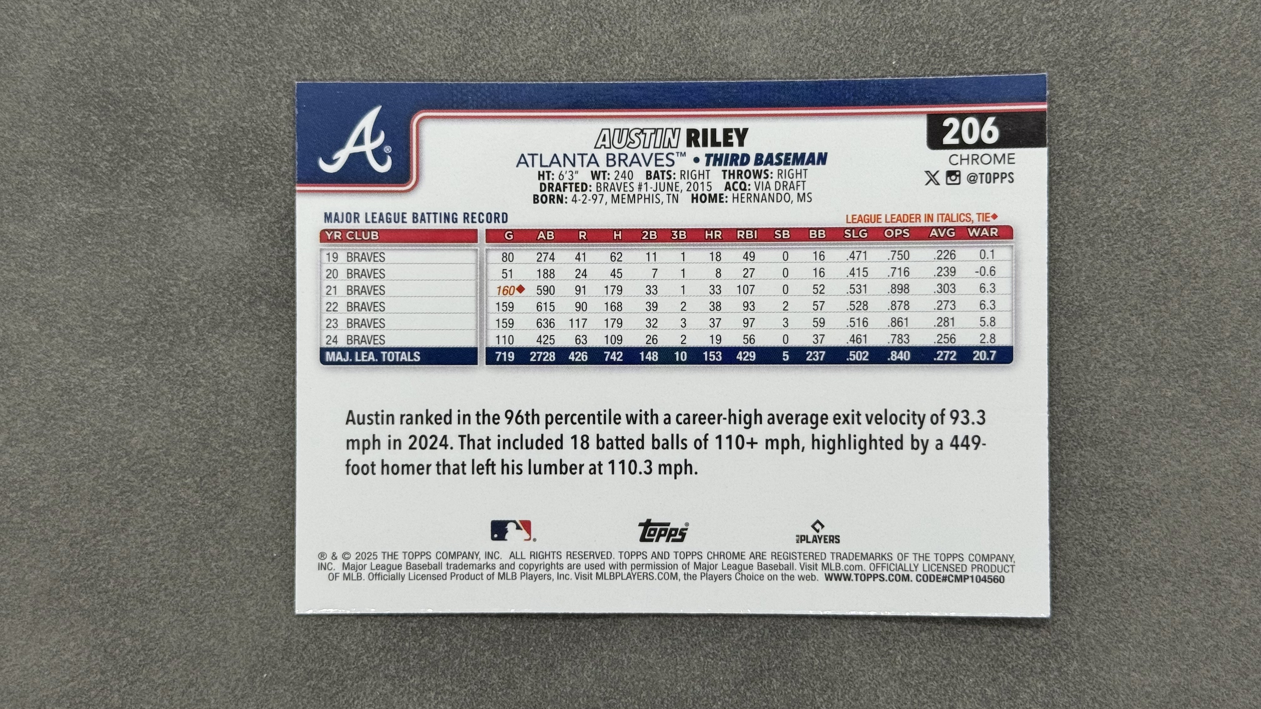 2025 Topps Chrome Austin Riley 勇士队 奥斯汀 莱利 银折 折射 SP变化版 选图好看 值得收藏#206
