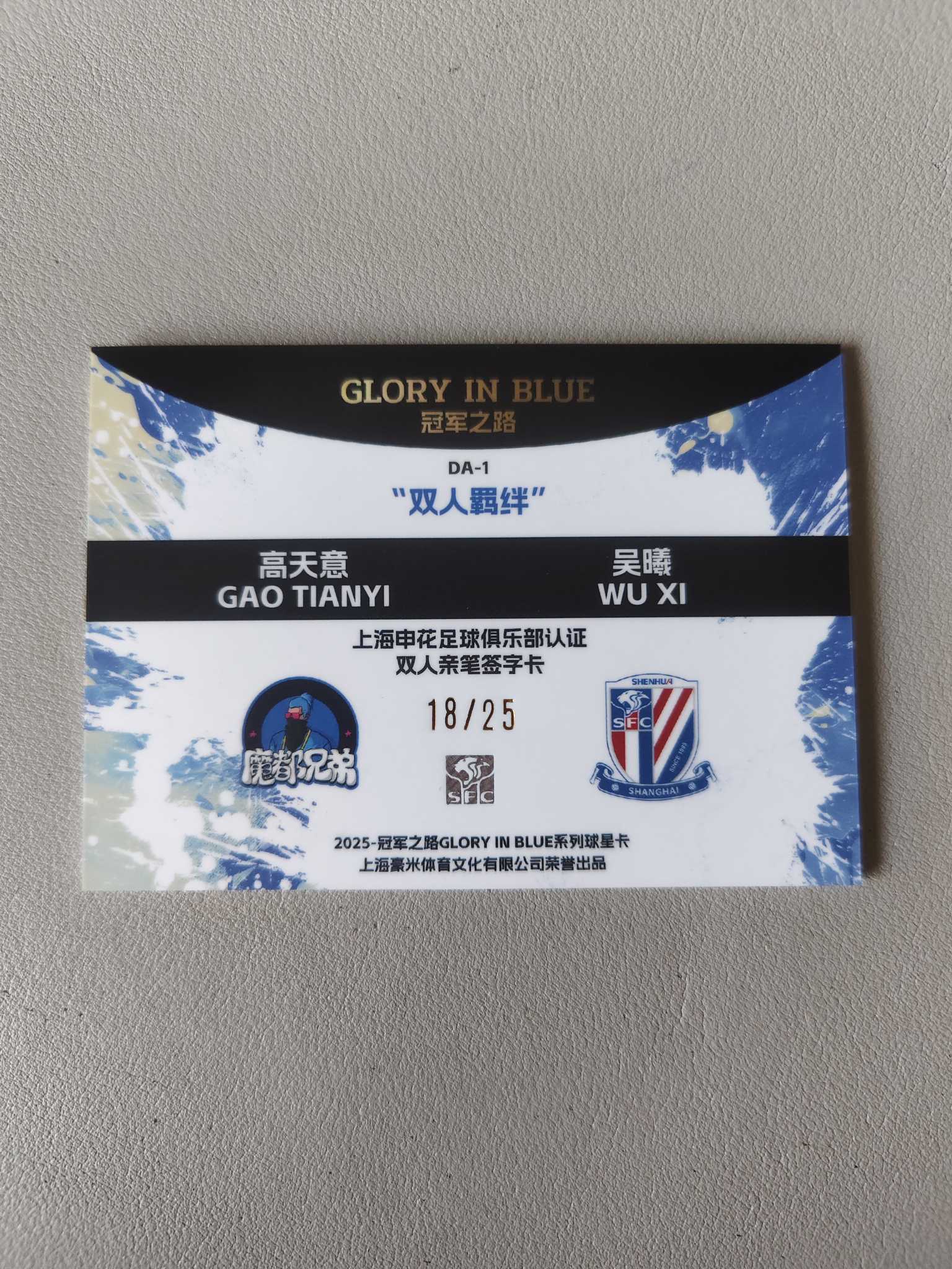 【佩妮拍卖】2025 豪米体育文化 冠军之路 GLORY IN BLUE 系列 申花荣耀 上海申花足球俱乐部 高天意 吴曦 双人羁绊 亲笔签名 /25编 卡品如图 拍前请阅读描述 li