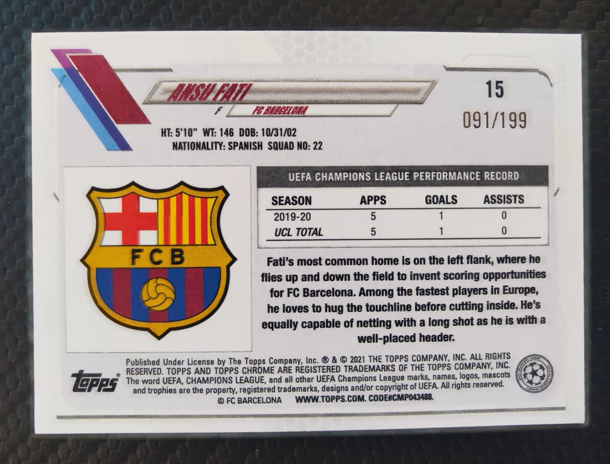 2021 Topps Chrome Ansu Fati 欧冠 TC 西班牙 巴萨 巴塞罗那 摩纳哥 安苏 法蒂 199编 青 波纹折射 实卡精美 卡品见图 阅读描述 小王
